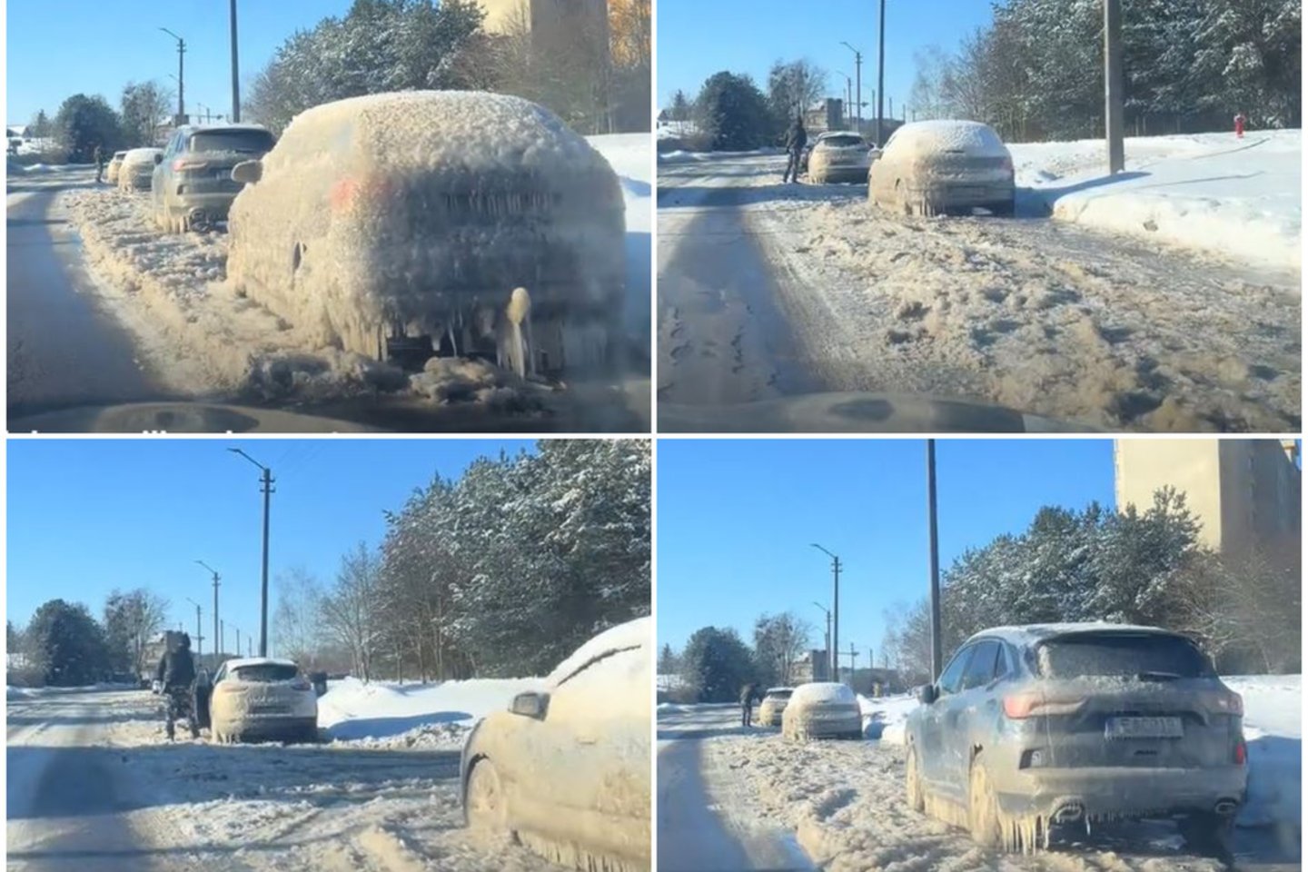 Iš „TikTok“ įrašų matyti, kaip vanduo kelkraštyje stovinčius automobilius užklojo ledo pluta.