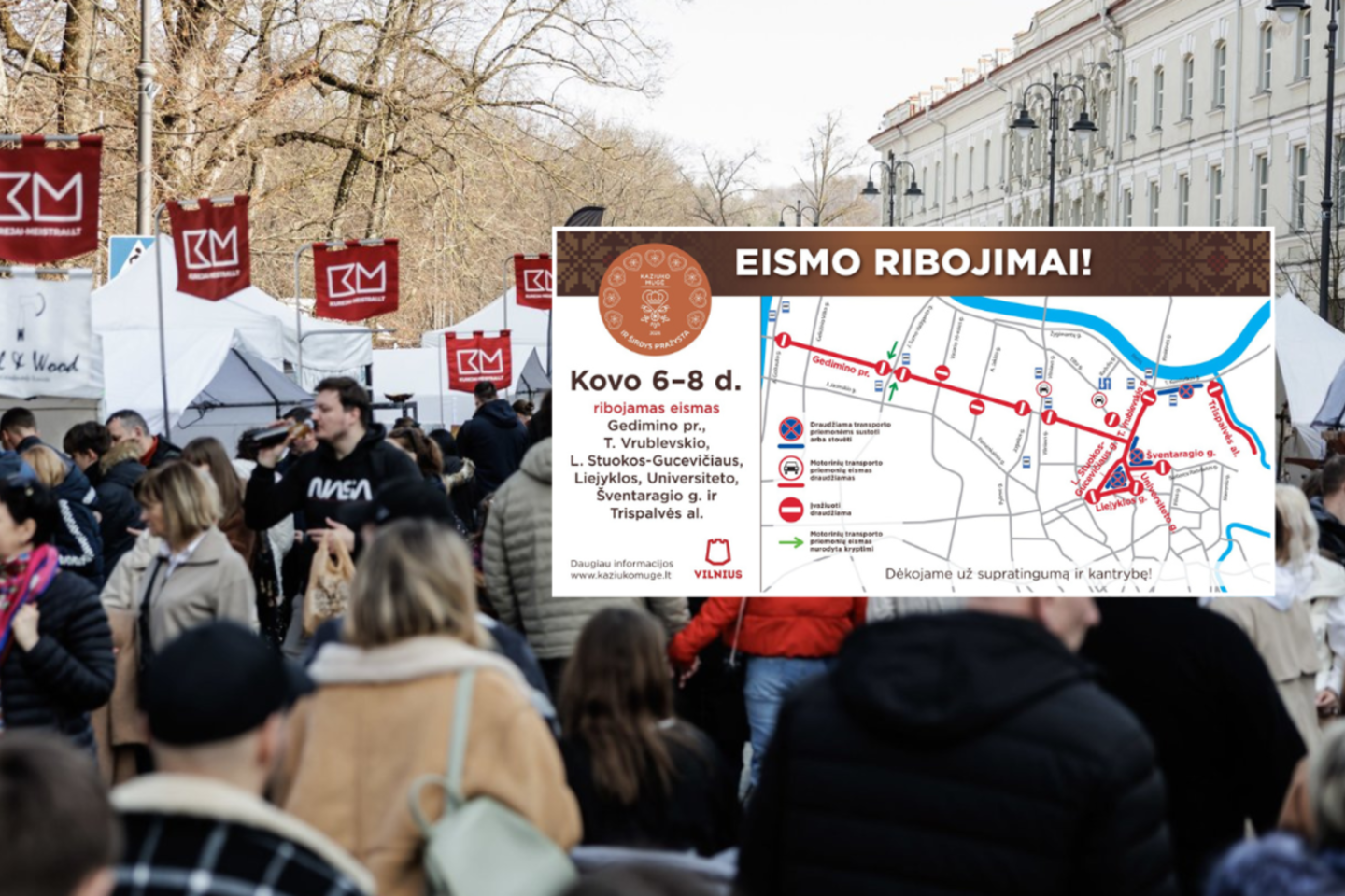 Nuo kovo 5 d. 9 val. iki kovo 9 d. 4 val. bus draudžiamas transporto priemonių eismas Gedimino prospekte nuo Šventaragio g. iki Vilniaus g., išskyrus mugės transportą.