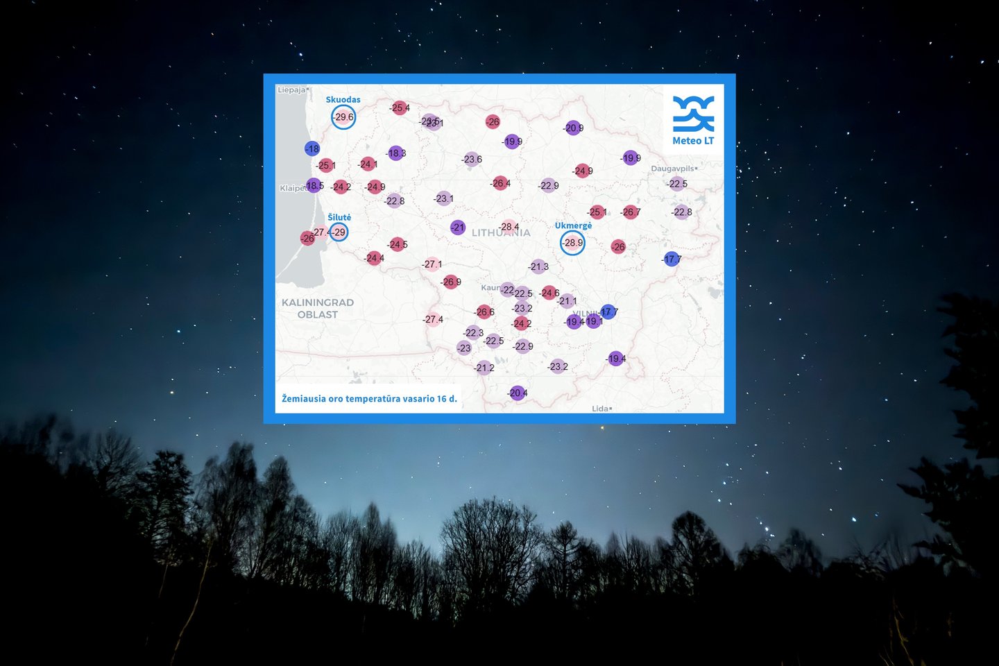 Lietuvos hidrometeorologijos tarnyba skelbia, kad pirmadienį ryte Skuodo automatinėje meteorologijos stotyje oro temperatūra buvo nukritusi iki -29,6 °C.