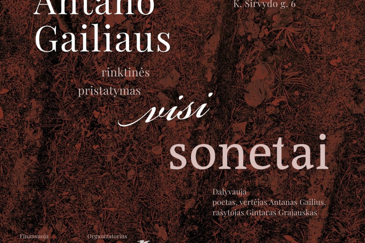 Balandžio 24 d., penktadienį, 18 val. Lietuvos rašytojų sąjungos Didžiojoje salėje vyks poeto, vertėjo Antano Gailiaus rinktinės „Visi sonetai“ pristatymas. Renginyje apie naująją knygą kalbėsis du Nacionalinės kultūros ir meno premijos laureatai – poetas, vertėjas Antanas Gailius ir rašytojas Gintaras Grajauskas.