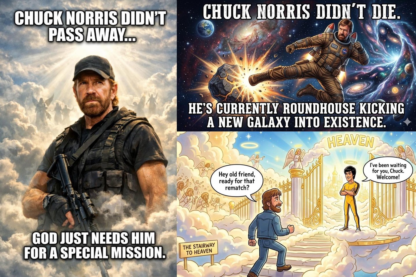 Kituose vaizduose netrūko ir gerbėjams puikiai pažįstamo humoro: „Chuckas Norrisas nemirė. Jis šiuo metu smūgiu iš kojos kuria naują galaktiką“ ar „Chuckas Norrisas neiškeliavo... Dievui jo tiesiog prireikė ypatingai misijai.“