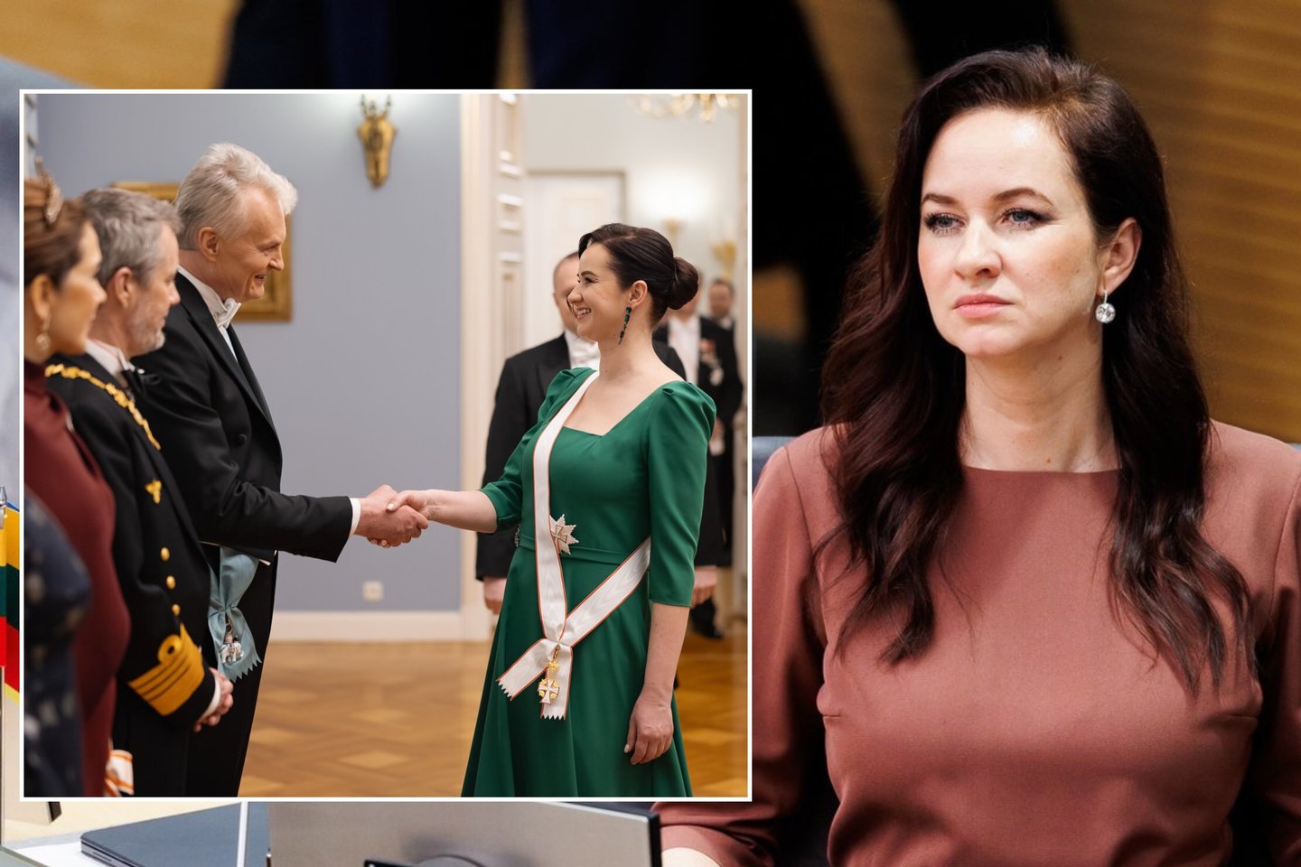 Vis dėlto pagrindiniu vakaro įvaizdžio akcentu tapo viena detalė – prie vakarinės aprangos priderinta juosta. Tai – iš danų karališkosios šeimos gautas valstybinis apdovanojimas.