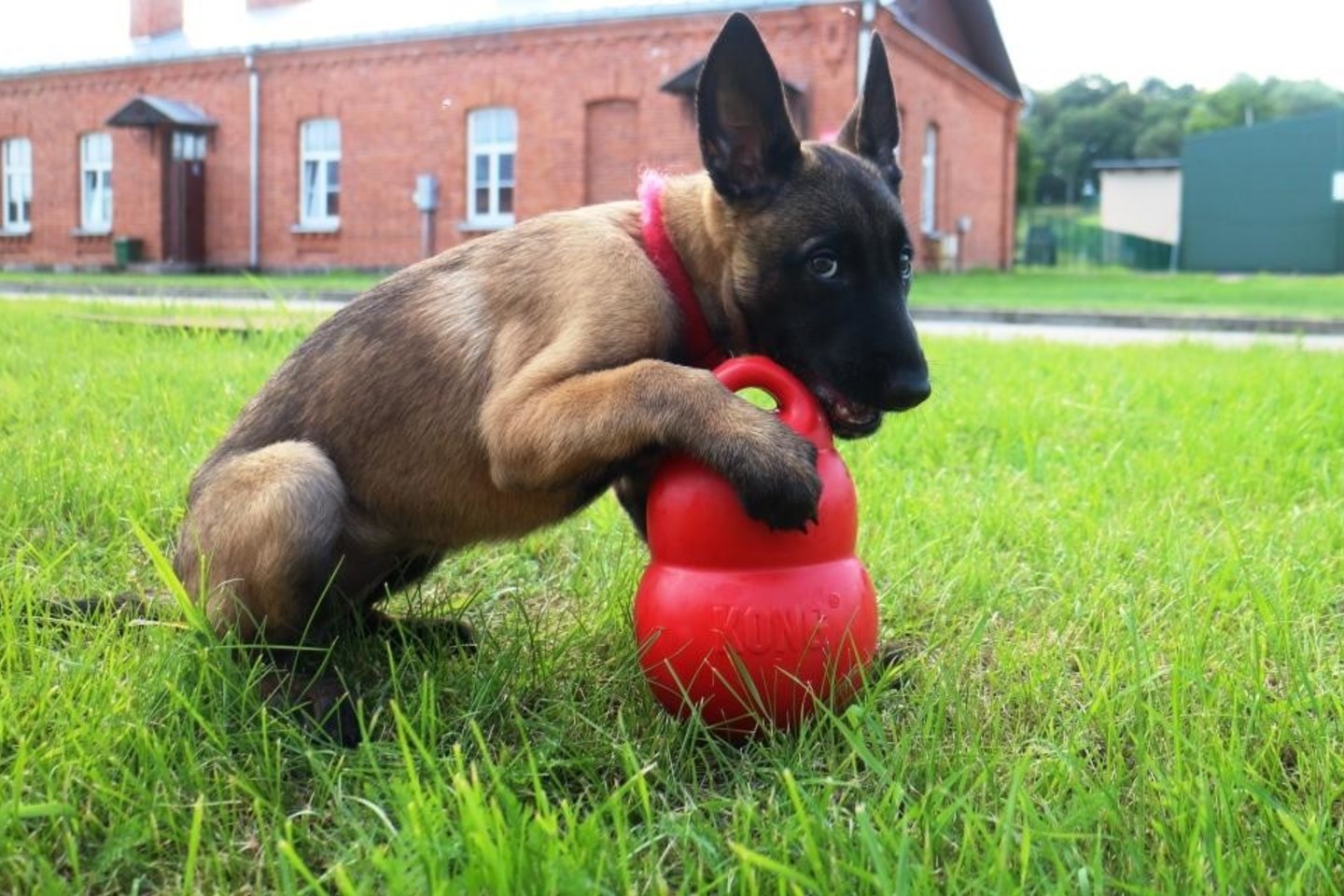 Šią liepą batalionas papildė jau turimus K-9 pajėgumus dar dviem žaismingais kelių mėnesių šuniukais. A.Jurgaitis dirbs ir mokysis su Belgų avigane Kaira, o E.Pakutka – Vokiečių aviganiu Goru.