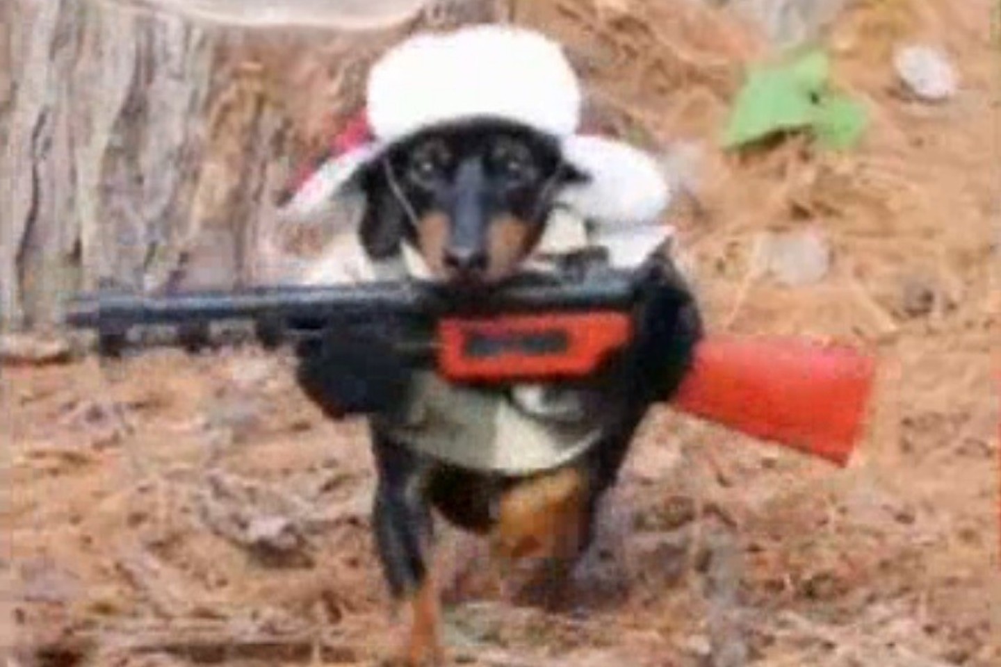 Vaizdelis, kurį įamžino šuns šeimininkas, tuoj pat pasklido internete. Pasirodo, taksas, vardu Crusoe medžioja tik su specialia apranga. Šuneliui po miškus lakstyti ir jaustis saugiai padeda tikra medžiotojo kepurė ir žaislinis šautuvas. Štai taip šeimininkas linksmai papuošė savo augintinį.