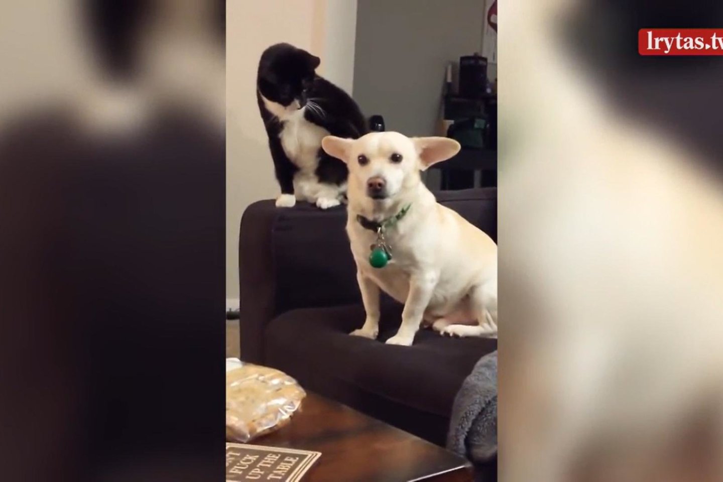 Įraše matyti, kaip katė bando kepštelėti per ausį savo draugužiui, tačiau tokio atsako, matyt, nesitikėjo. Situaciją filmavusi ir stebėjusi augintinių šeimininkė fone prapliupo juokais.