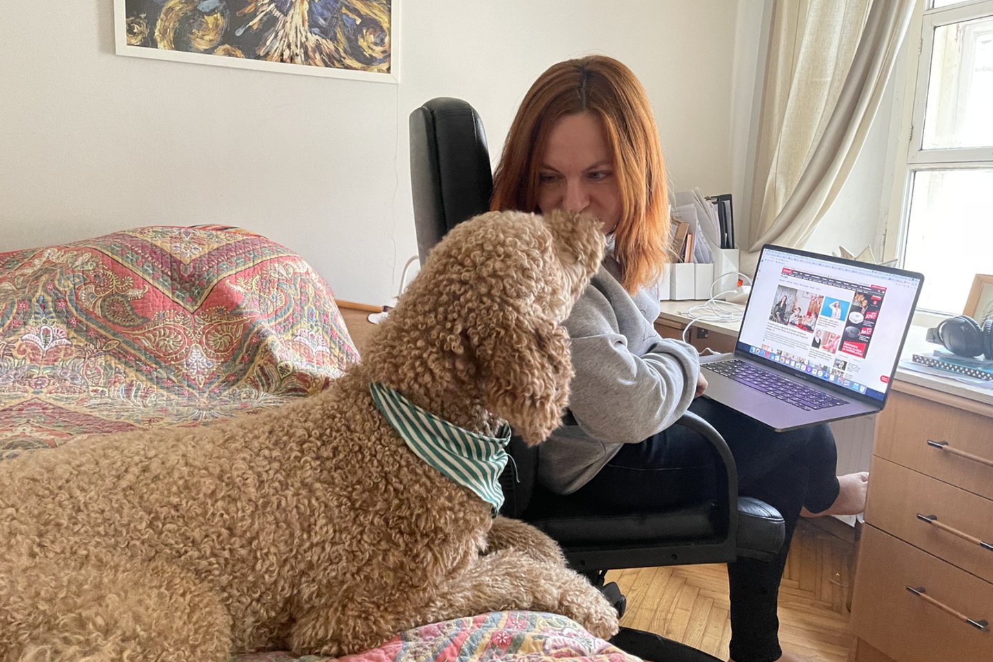 Bene geriausiai lrytas.lt kolegoms pažįstamas Tėvams rubrikos redaktorės Godos Prapuolenytės-Leonavičienės keturkojis Grehemas. Dar iki karantino, Grehemas beveik kasdien keliaudavo su ja į redakciją, kur pirmiausia apsukdavo garbės ratą pro kolegų rankas ir su džiaugsmu leisdavosi išglostomas. O tuomet ramiai miegodavo po stalu. Tad karantinas pakeitė ir jo įprastą darbo dieną.