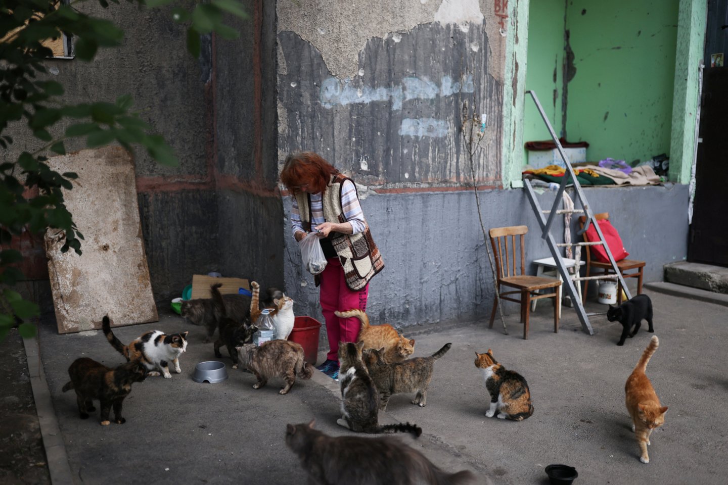 68 metų Natalija Pasternak nuo karo pradžios kiekvieną rytą vaikšto po subombarduotus savo rajono pastatus Charkove ir neša maistą katėms, kurias paliko šeimininkai.