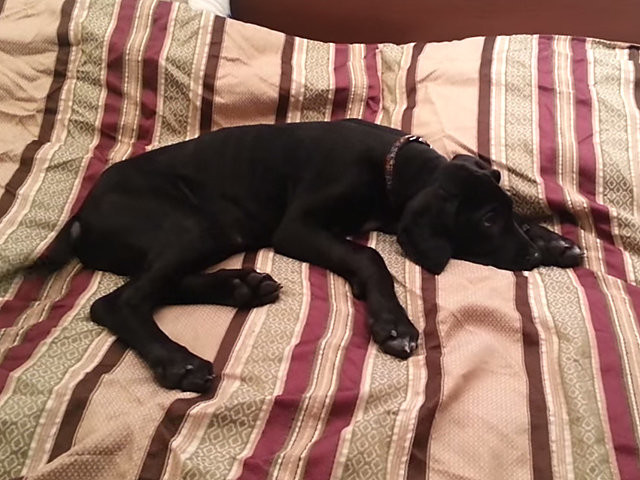 Šuo tik vartosi, keičia miego pozas ir patogiai įsitaiso, kad galėtų snausti toliau.