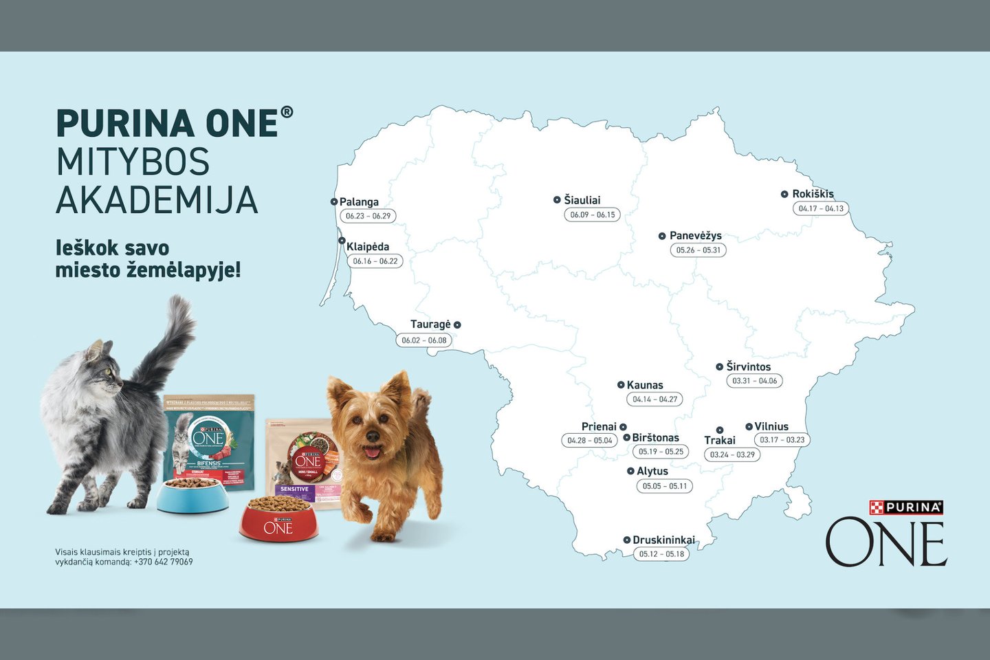 Iki birželio 29 d. „Purina ONE“ mobili mitybos akademija apsilankys Vilniuje, Trakuose, Širvintose, Rokiškyje, Kaune, Marijampolėje, Prienuose, Alytuje, Birštone, Šiauliuose, Panevėžyje, Tauragėje, Kretingoje, Klaipėdoje, Palangoje ir Kunigiškėse o vėliau patrauks į Latviją ir Estiją. Visą maršrutą galite sekti čia.