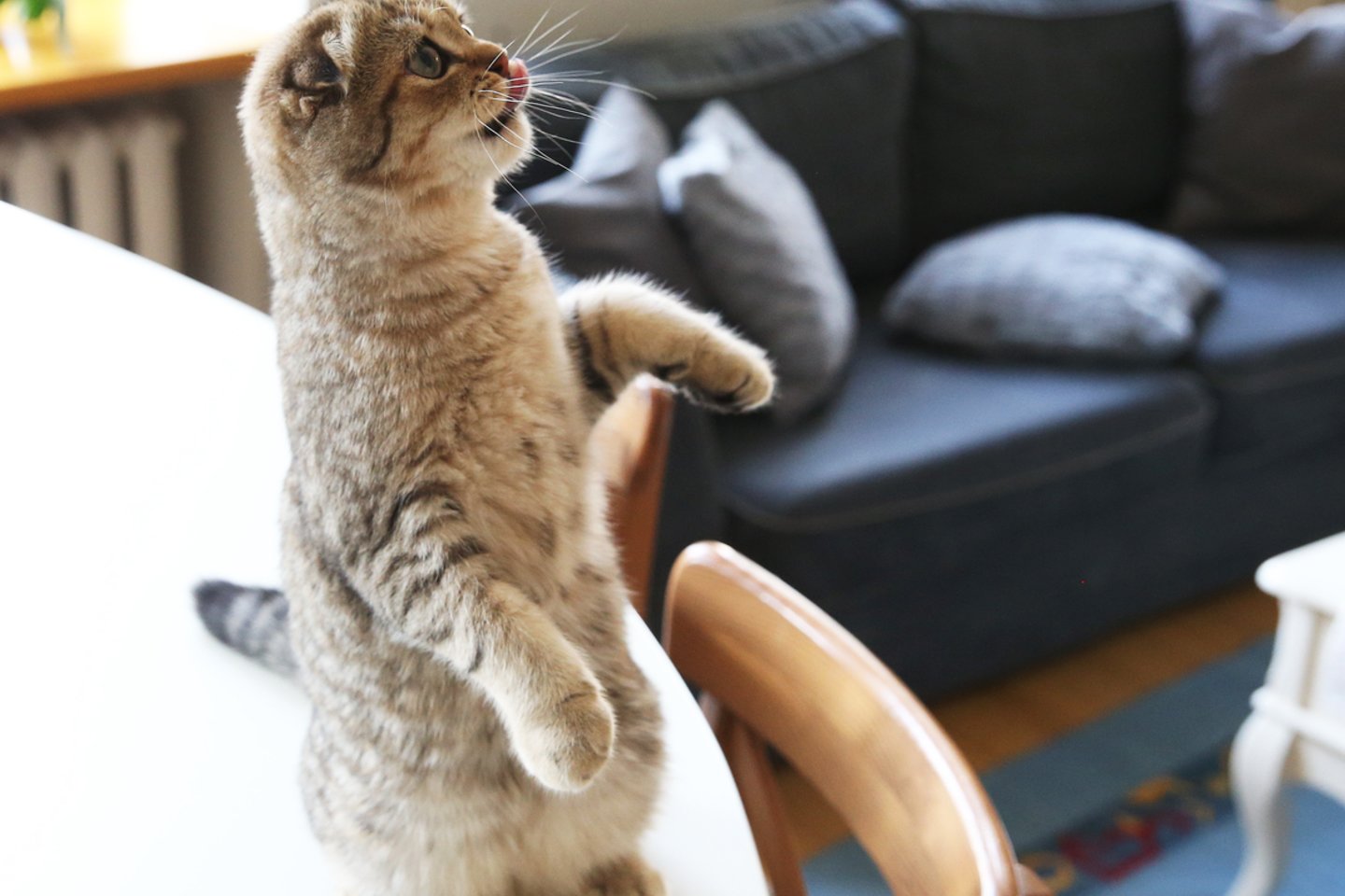 Katės mėgsta trukdyti žmonėms dirbti, šokdamos ant stalo. Nesvarbu, ar skaitote knygą, ar dirbate kompiuteriu – jos be dvejonių atsiguls tiesiai ant to daikto. Taip katė tarsi sako: „Sustok ir atkreipk į mane dėmesį“. Ji nori, kad jūs ją glostytumėte, o ne užsiimtumėte su bet kokiu kitu daiktu.