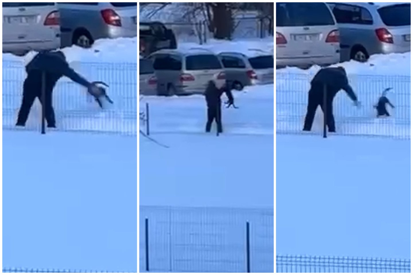 Vaizdo medžiagoje matyti, kaip asmuo trenkia šunį į žemę, o vėliau jį tampo už pavadėlio.