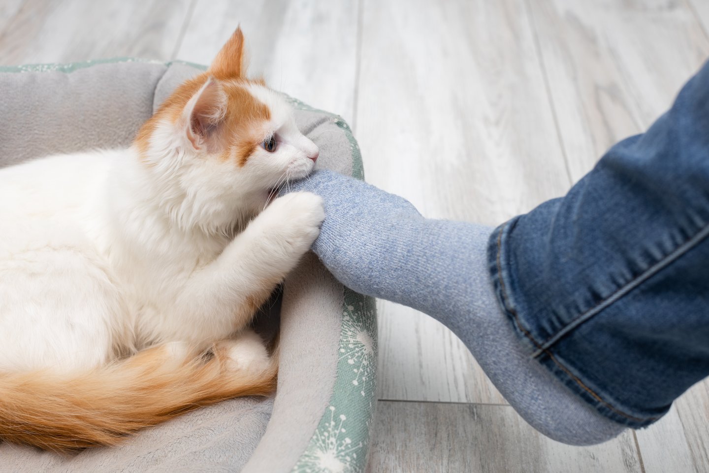 Mažam plėšrūnui mūsų kojos yra lengviausiai pasiekiamas taikinys kontaktui užmegzti. Kai įprastas miaukimas ar bandymai trintis galva yra ignoruojami, katė gali imtis radikalesnių metodų. Lengvas įkandimas ar staigus puolimas naudojant nagus dažnai yra desperatiškas bandymas atkreipti šeimininko dėmesį. Norint išvengti tokių atakų, reikėtų skirti laiko žaidimams su augintiniu dar prieš jam pradedant medžioklę.