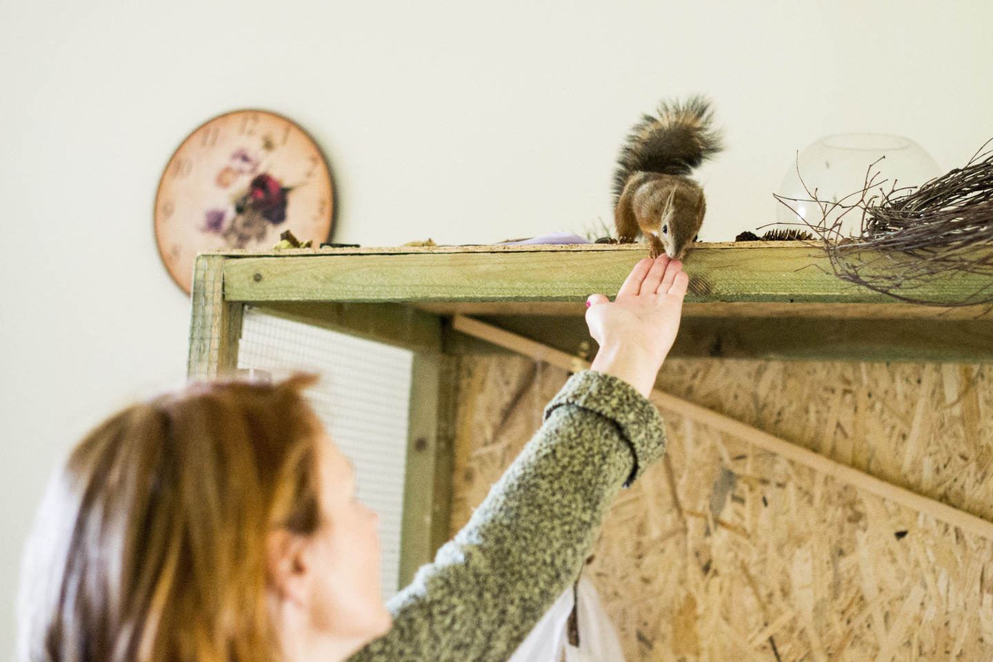 Pradžioje apgyvendinome Kaštonę pintame krepšyje, kurį laiką buvo ramu, o kai vieną dieną ji iš ten išlindo ir pasislėpė, supratome, jog laikas galvoti apie rimtus, erdvius namus. Vyrai įrengė didelį narvą – voljerą su šakomis ir kelmais ir Kaštonė jame apsigyveno.