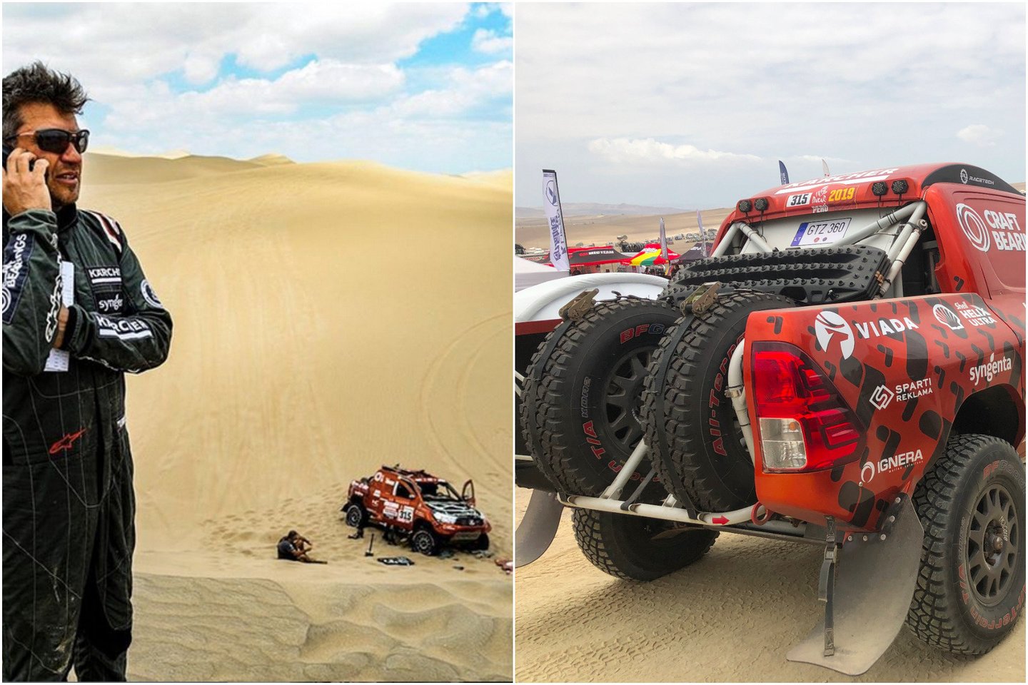 „Važiavom „apgraibom“, pergazavau ir prisidirbom – kylant į kopą koja nuslydo nuo pedalo ir vsio, – apie incidentą užsiminė lenktynininkas. – Važiuojam su dažnais sustojimais, kaista variklis, pažeista elektros sistema, bet per valandą turėtume atsikapstyt iki finišo, kitaip nebus, dirbam, nepasiduodam.“