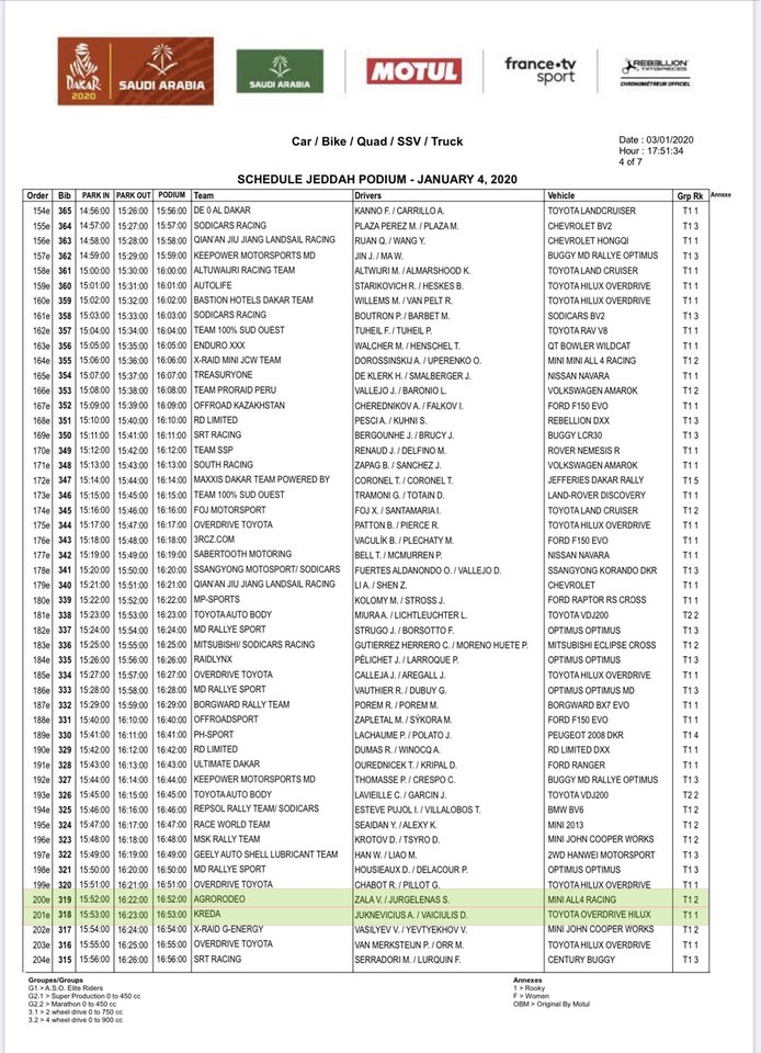 „Agrorodeo“ ekipažas, kuriam teko 319 startinis numeris, ant podiumo pakylos užvažiuos 15.52 val. (Lietuvos laiku), o iškart po jo pasirodysiantis „Kredos“ ekipažas, su užklijuotu 318 startiniu numeriu, pasirodys 15.53 val.