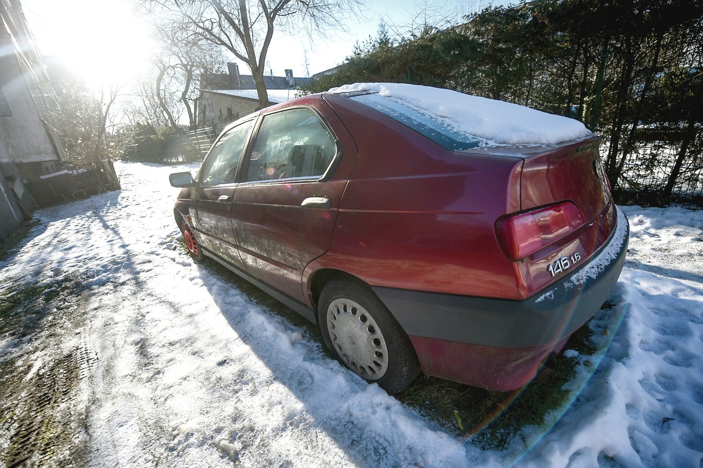 Tokių kiemuose apsigyvenusių automobilių Žirmūnų kiemuose – ne po vieną. Šis rajonas kledarų skaičiumi tikrai išskirtinis. Tai įrodydami pareigūnai sustojo prie gretimo namo. Šalia jo – ratais į veją įaugęs „Alfa Romeo 146“.