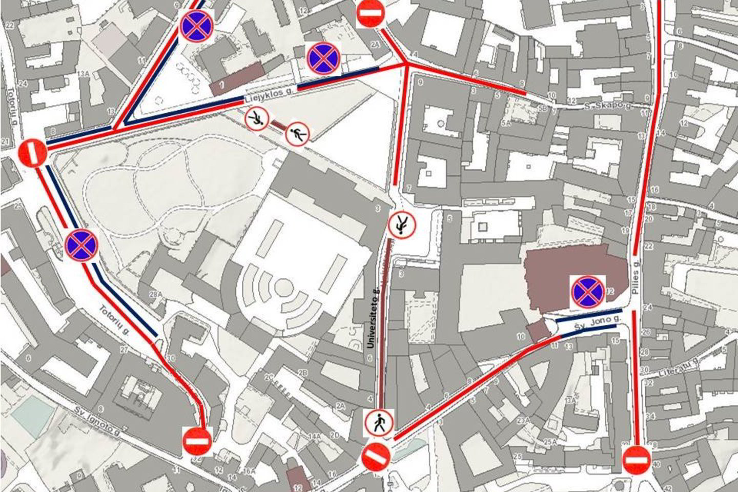 Nuo 10.00 val. iki 13.00 val. bus draudžiamas ir pėsčiųjų eismas Universiteto gatve nuo pastato S. Daukanto a. 3 iki Dominikonų gatvės.