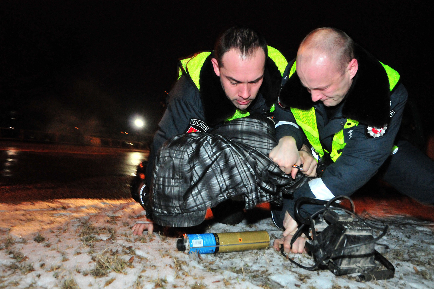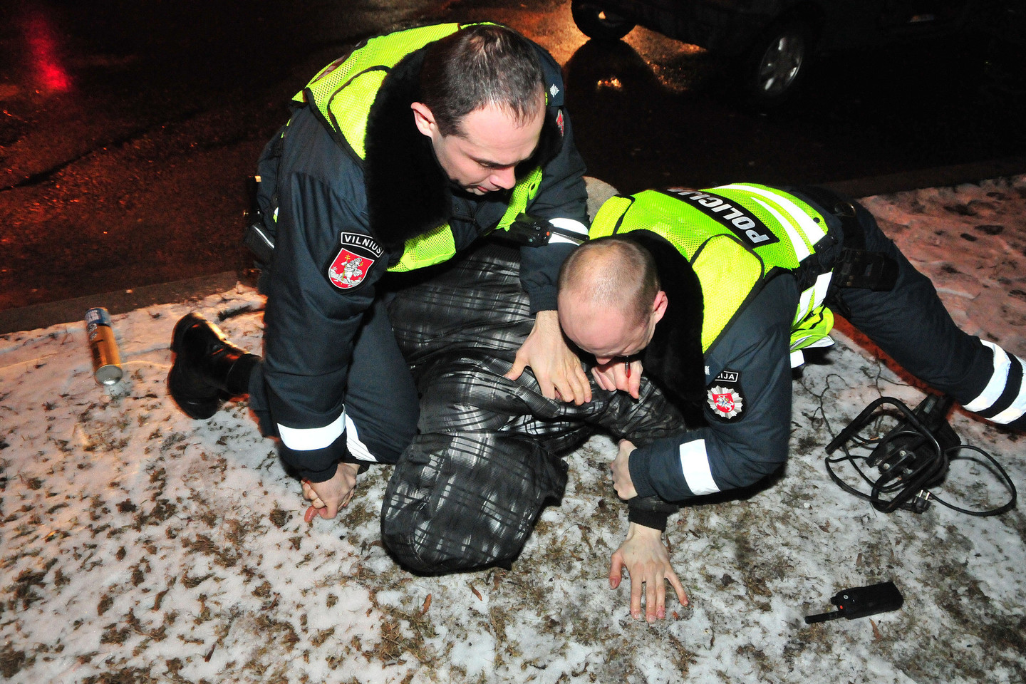 Visa tai vyko girtam vairuotojui protokolą rašiusių policininkų akivaizdoje ir vos pora žingsnių nuo jų. Pareigūnai sureagavo žaibiškai. Užpuolikas buvo parverstas ant žemės ir prispaustas. Tačiau surakinamas antrankiais jis lengvai nesileido. Ir tik pareigūnams pagrasinus panaudoti elektros šoką, girtą chuliganą pavyko sutramdyti.