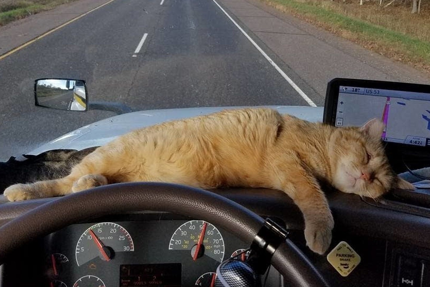 Vyras be pašonėje ilgą laiką buvusio bendražygio pristatė du krovinius ir įveikė 400 mylių (640 kilometrų). Po paskutinio darbo pildydamas dokumentus staiga pastebėjo iš po sunkvežimio išlendantį katiną.