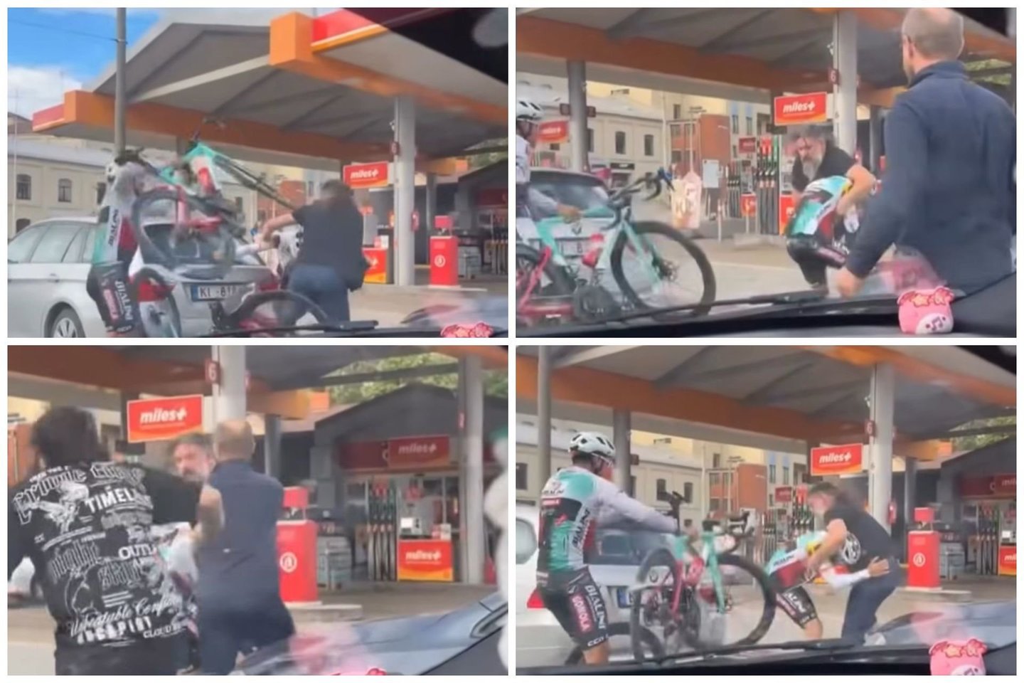 Jame matyti, kaip rimtai susikibo dviratininkas, vilkintis sportinį kostiumą, su juodai apsirengusiu vyru.