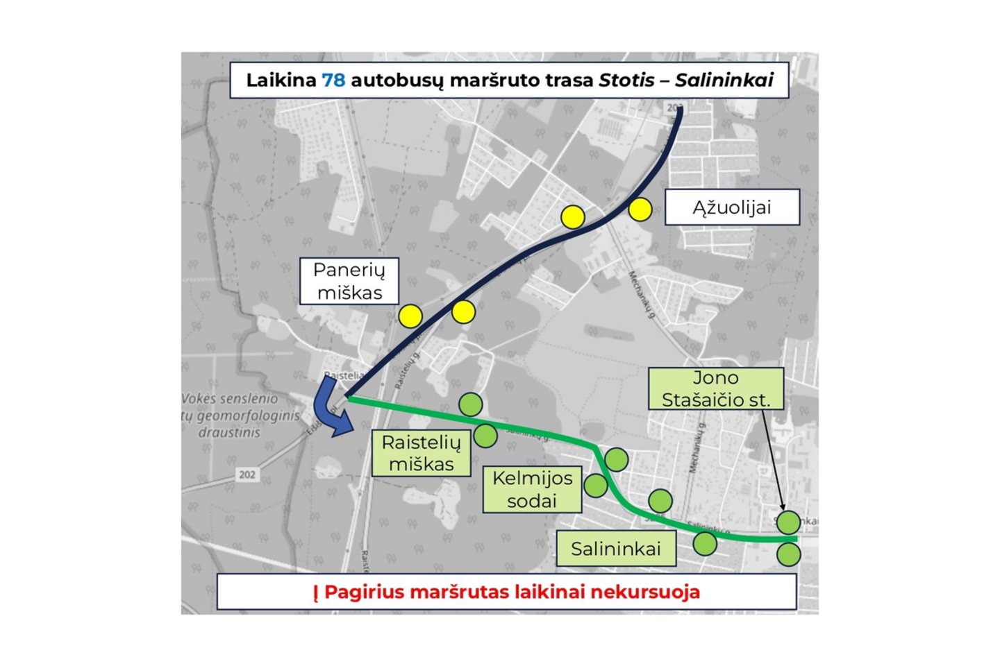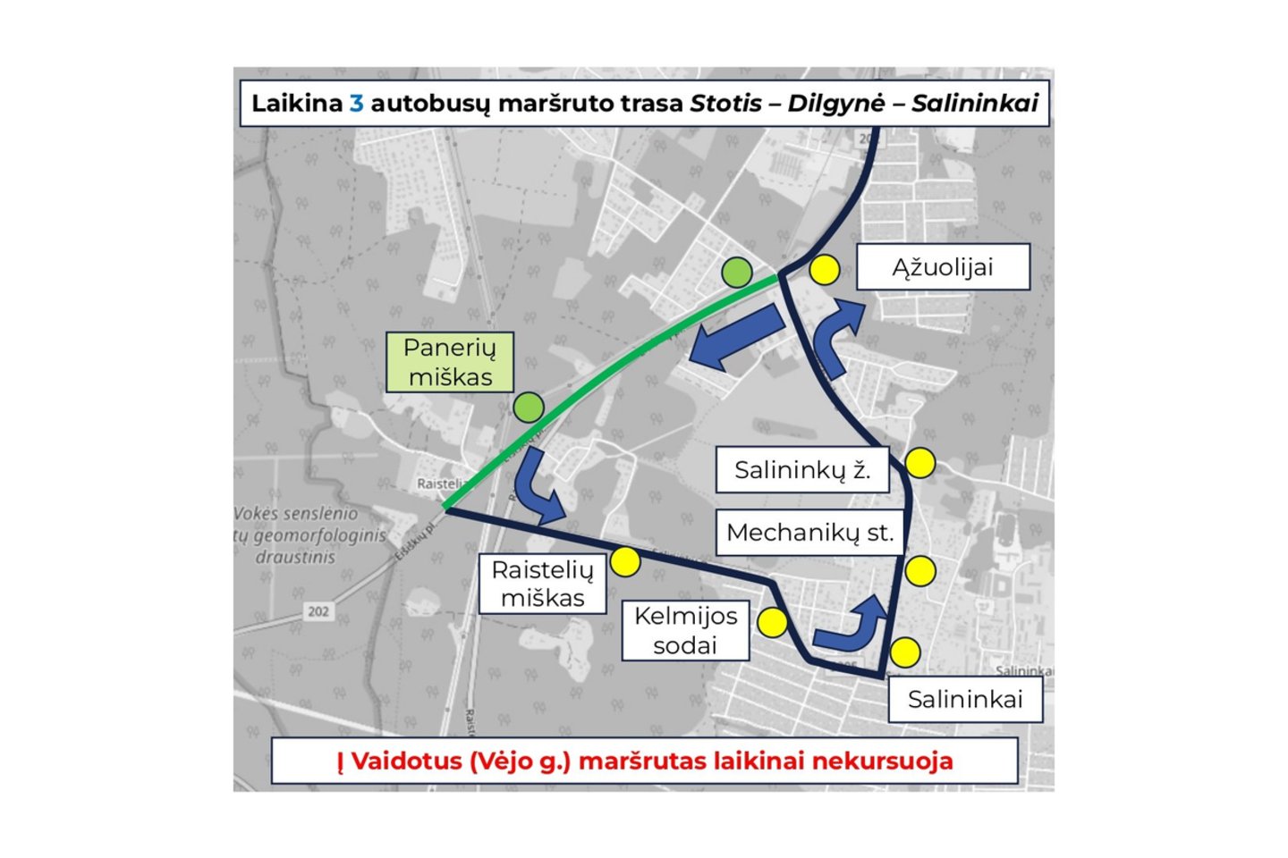 3 autobusų maršrutas „Stotis–Eišiškių pl.–Dilgynė–Salininkai–Vaidotai“ kursuos pakeista trasa iki Salininkų.