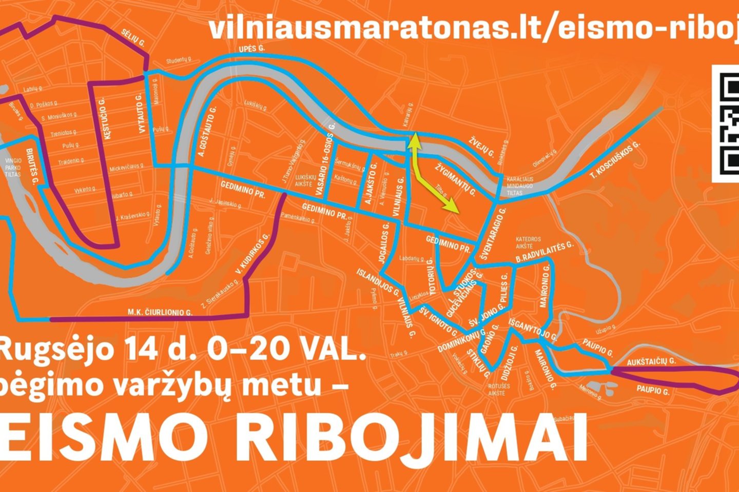 Rugsėjo 14 d. nuo vidurnakčio iki 20 val. bus ribojamas eismas bėgimo trasose (informacija žemiau). Po 15 val. bus atidarytas eismas V. Kudirkos, M. K. Čiurlinio gatvėmis, taip pat Žvėryno rajone, išskyrus Upės, Vytauto ir A. Mickevičiaus gatves, Aukštaičių g. dalyje nuo 2A iki 34 numeriais pažymėtų statinių ir Paupio g. dalyje nuo 17 iki 60 namo.
