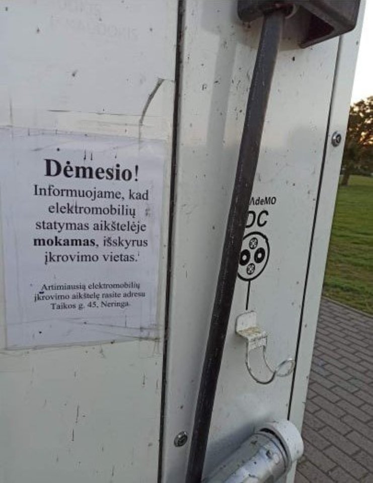 Neringos savivaldybės administracijos direktoriaus pavaduotojas Sigitas Šveikauskas teigė, kad, atsižvelgiant į didelius poilsiautojų srautus ir nedidelį automobilių stovėjimo vietų skaičių Nidoje, kai kuriose stovėjimo aikštelėse, kurios yra labai apkrautos ir mokamos, nuo gegužės iki rugsėjo mėnesio pabaigos, kaip ir kitoms transporto priemonėms, elektromobiliams yra taikomas mokestis už stovėjimą.