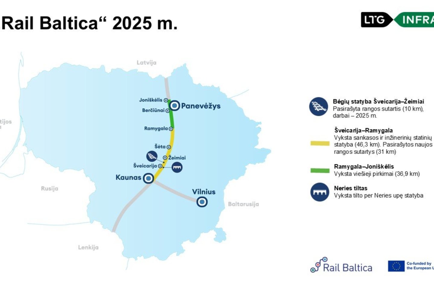 Viso Lietuvoje vykdoma pagrindinės geležinkelio linijos statyba ir pasirašytos sutartys darbams 77 km ruože. Iki šių metų bus pasirašomos sutartys, pradėti parengiamieji ir vykdomi statybos darbai 114 km ruože. Statybos darbų vykdymas finansuojamas iš Europos Sąjungos ir valstybės biudžetų.