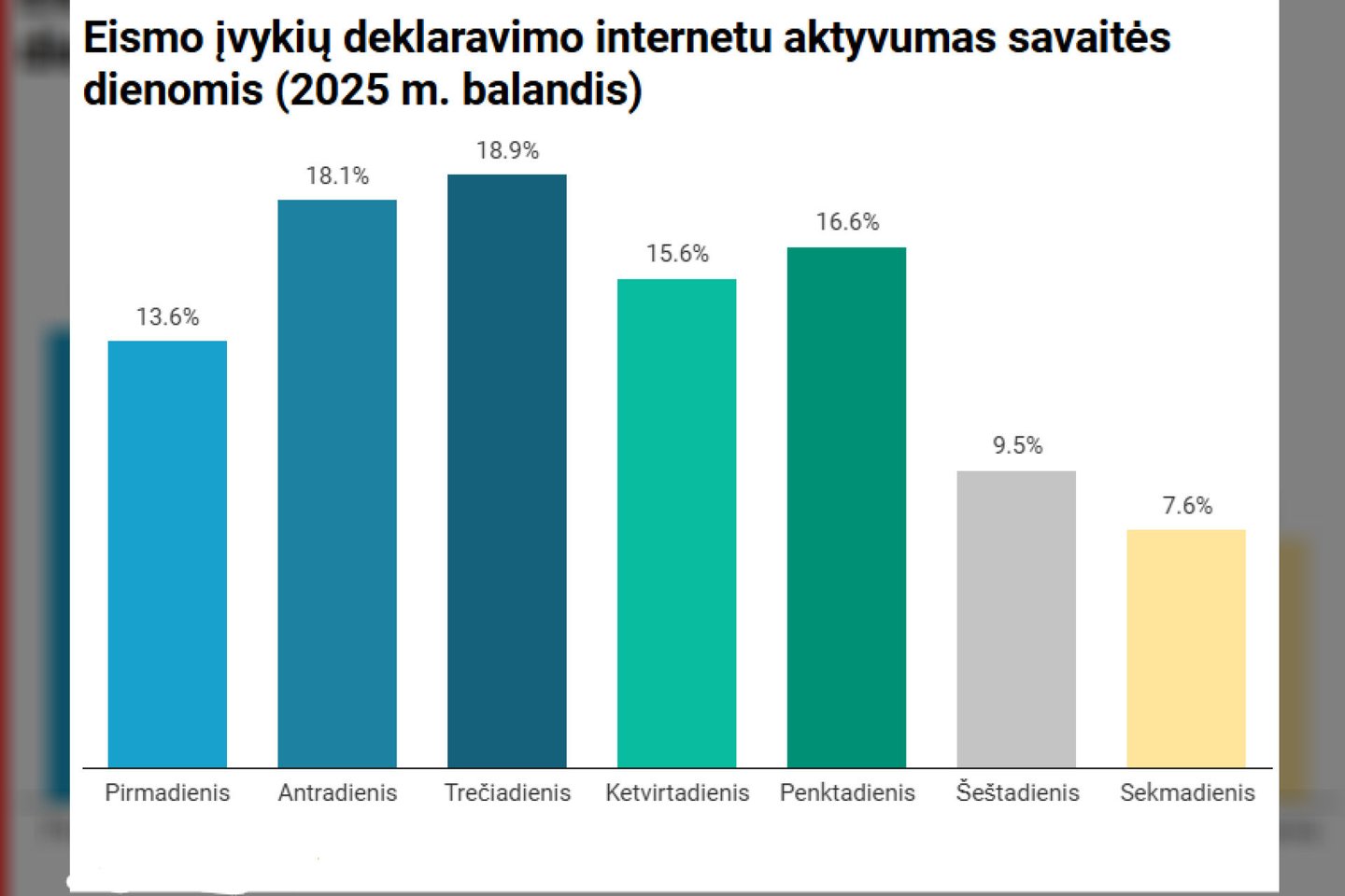 Įdomus faktas – daugiausia elektroninių deklaracijų per DRAUDIMOĮVYKIAI.LT pateikiama antradieniais ir trečiadieniais, o mažiausiai – sekmadieniais.