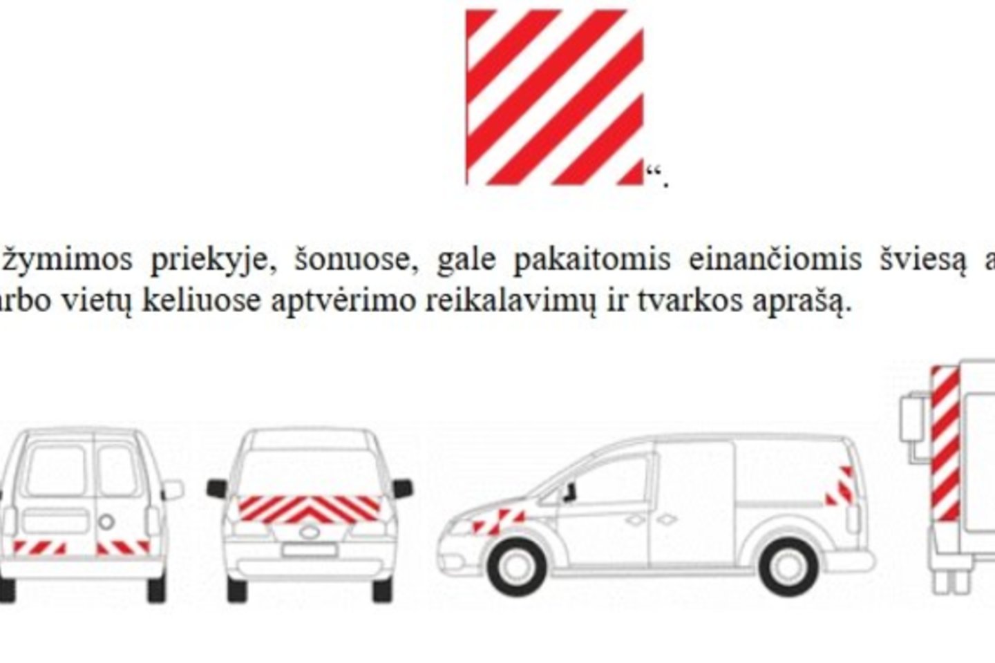 Papildomai numatyta, kad kelio darbų transporto priemonės turės būti aiškiai pažymėtos raudonai ir baltai dryžuotomis atšvaitinėmis juostomis, o išsikišantys kroviniai privalės būti žymimi specialiais šviesą atspindinčiais kvadratiniais ženklais bei žibintais.