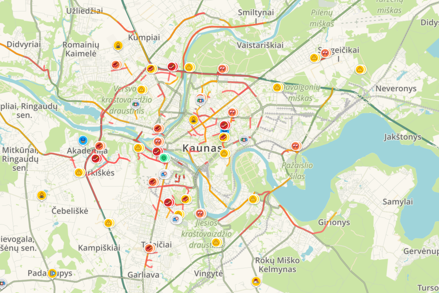 8 valandą Vilniuje pagal šį žemėlapį buvo užfiksuotos 24 grūstys ir 5 eismo įvykiai. Apie 10 valandą žemėlapis rodė 8 grūstis ir 9 eismo įvykius.