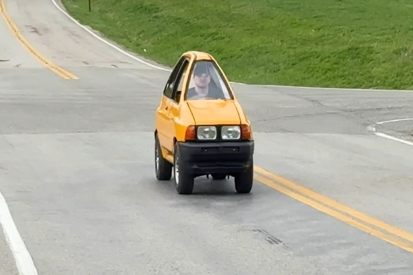 Dabar šis „Ford Festiva“ yra dvivietis, o vienintelis keleivis sėdi už vairuotojo – visai kaip ant motociklo. Kūrėjams teko net apkarpyti vairą, nes jis pasirodė esąs per platus naujajam salonui.