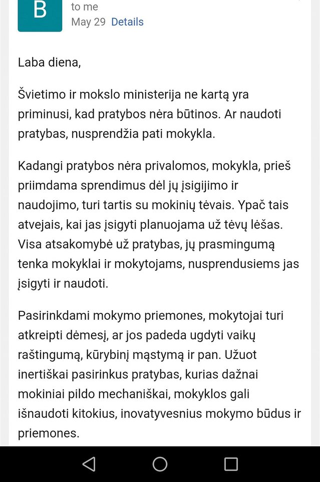 Prisegu ministerijos atsakymą į mano klausimą apie pratybų ir uždavinynų būtinumą. Jeigu, jūsų manymu, pratybos ir uždavinynai yra būtina priemonė, derinkite tai su ŠMSM!