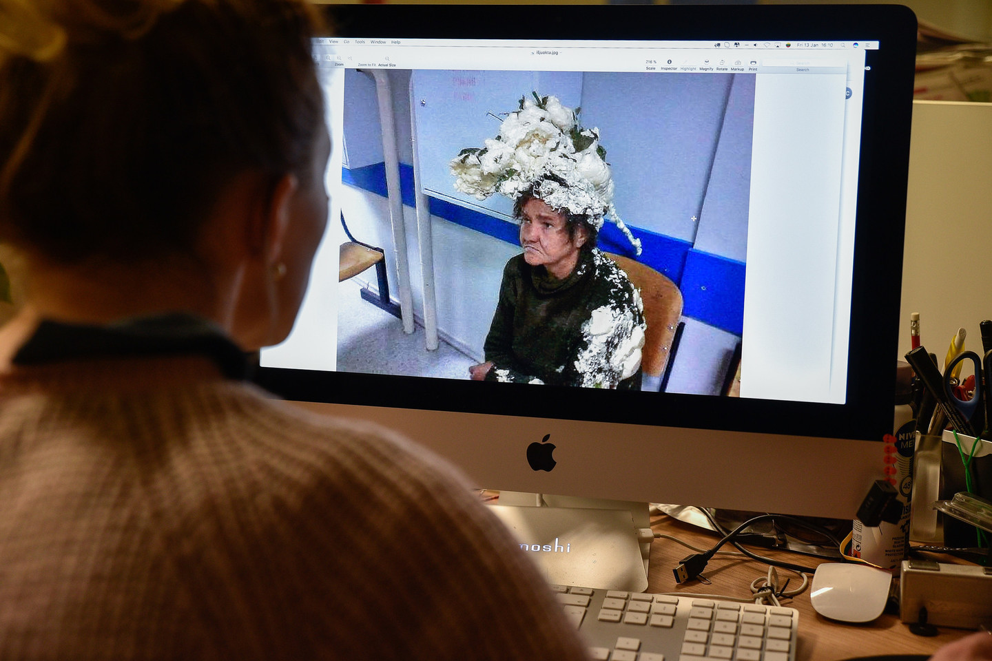 Tačiau iš nuotraukoje nusiminusios moters atrodo, kad ji buvo užpulta kokių nors vaikėzų ir apipurkšta putomis.