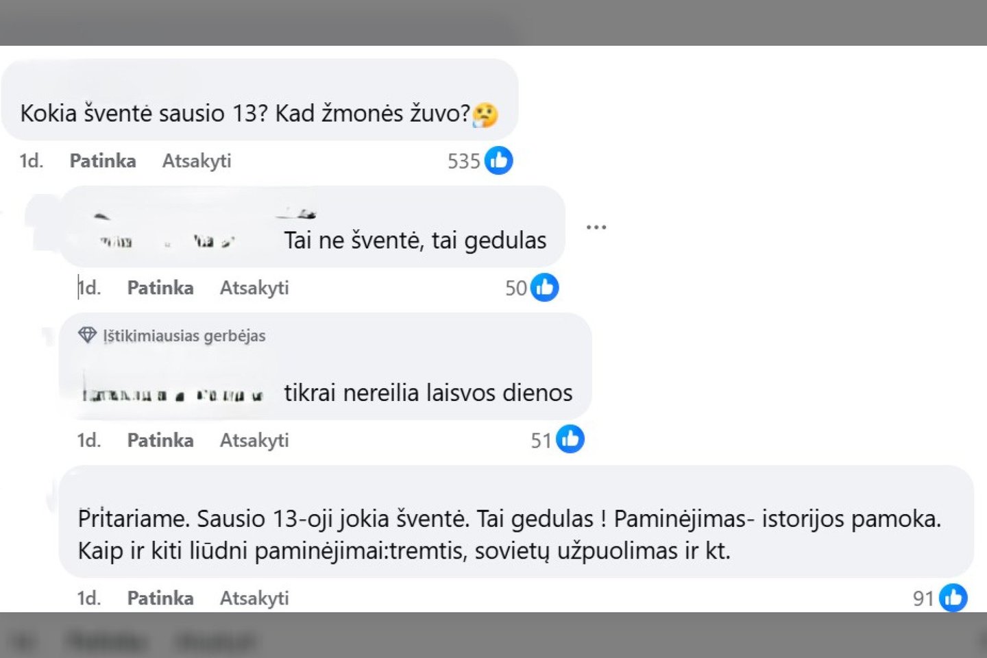 „Kokia šventė Sausio 13? Kad žmonės žuvo?“ – stebėjosi vienas komentatorius. „Sausio 13-oji – jokia šventė. Tai – gedulas! Paminėjimas, istorijos pamoka. Kaip ir kiti liūdni paminėjimai: tremtis, sovietų užpuolimas ir kt.“ – antrino kitas. „Rado dėl ko džiaugtis, – žmonių žūtis – ar čia vadinasi šventė?“ – savo nuomonę liejo Lrytas.lt skaitytoja. „Sausio 13– ąją prisiminsiu, kol gyva būsiu, nes stovėjome prie Seimo rūmų visą parą, bet daryti laisvadienį, manau, nereikia, čia tik mano nuomonė“, – sutiko kita skaitytoja.
