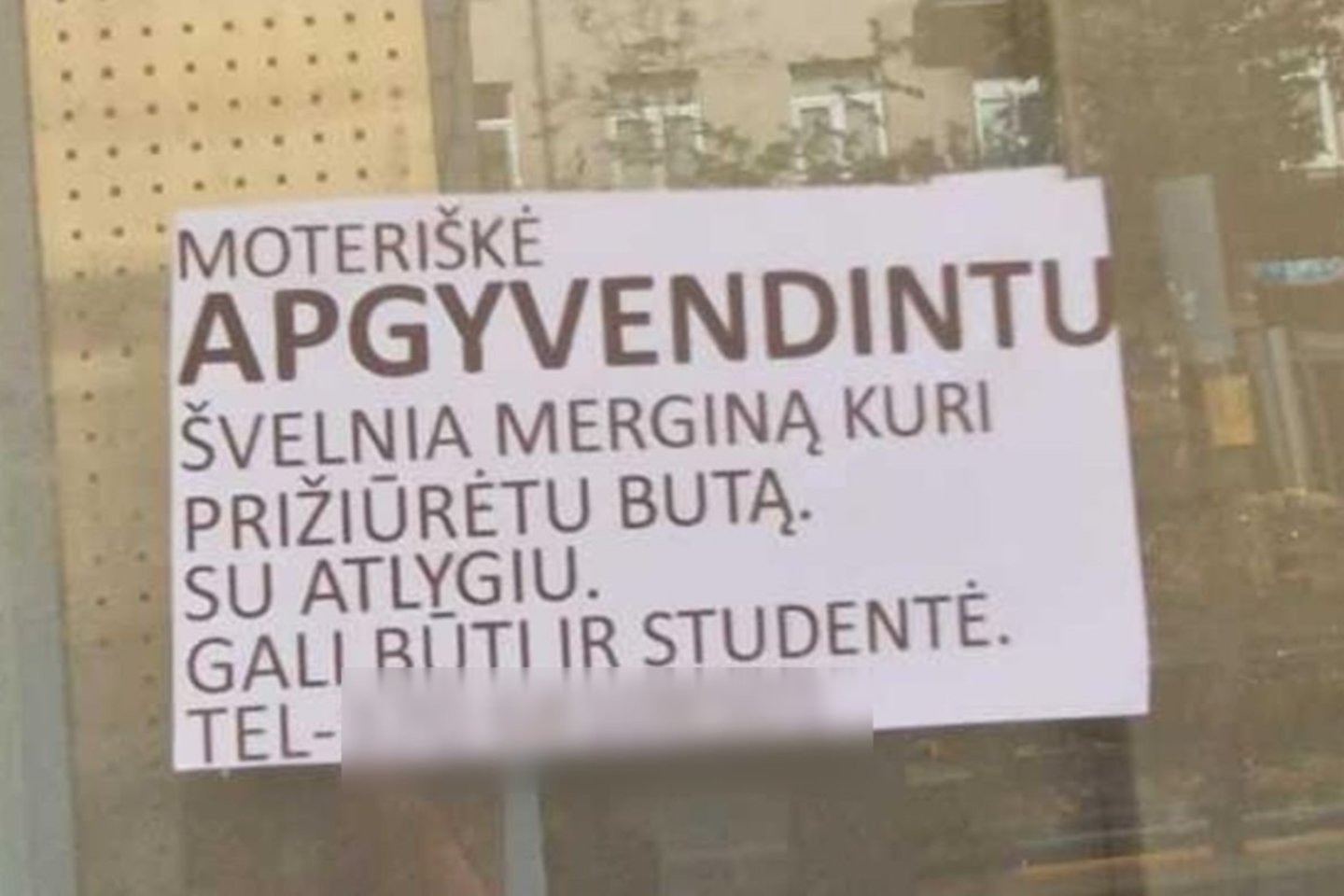„Moteriškė apgyvendintų švelnią merginą, kuri prižiūrėtų butą. Su atlygiu. Gali būti ir studentė“, – su klaidomis rašoma skelbime, kuriame nurodomas ir telefono numeris.