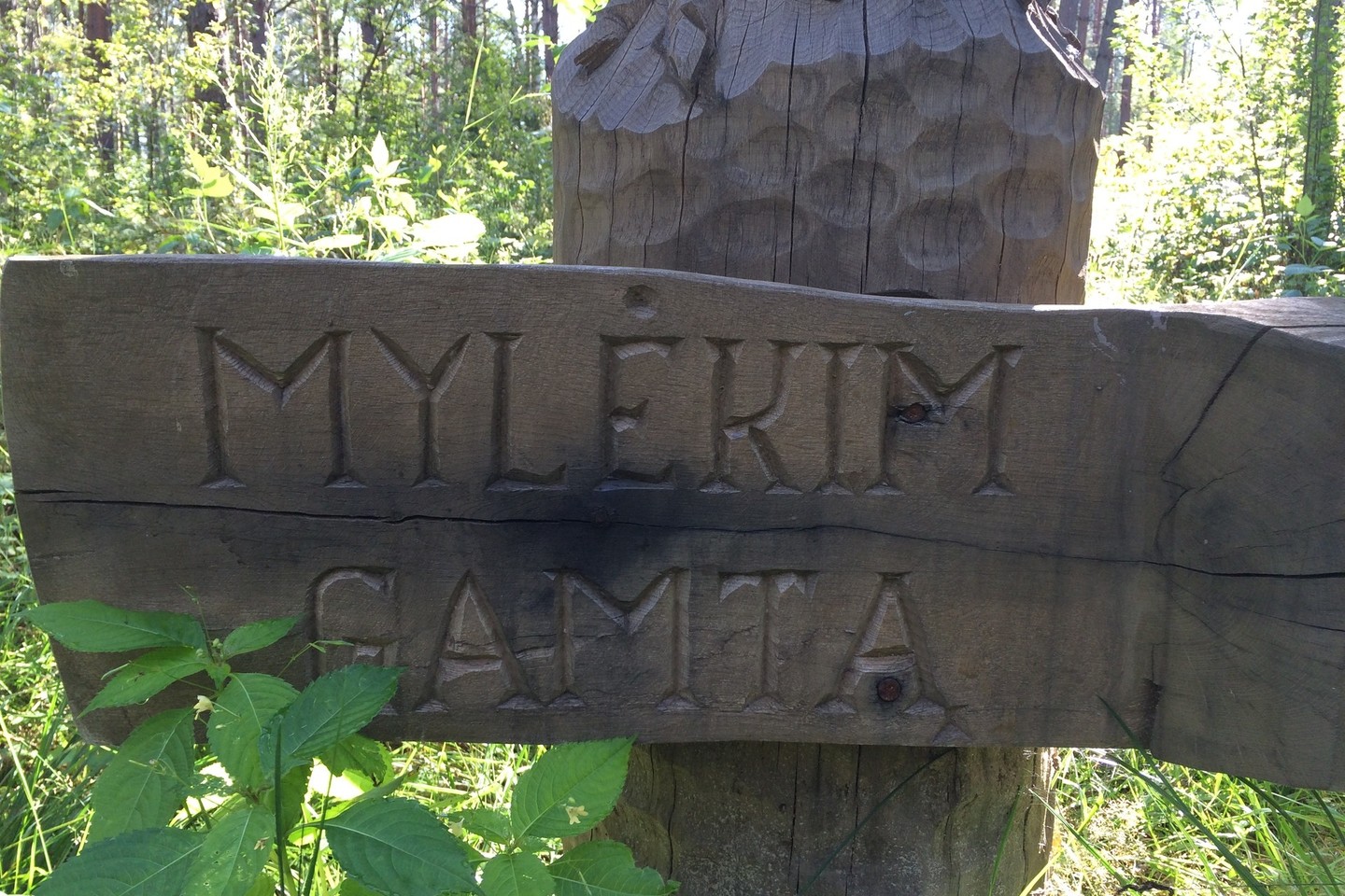 „Mylėkim gamtą!“ – ragina medinės pelėdos laikomas užrašas. Pagalvoju: o gal išties žmogus idealistas tą parką įkūrė ir užmaskavo, nes jam tiesiog malonu nustebinti tokį užklydusį grybautoją kaip aš pasakiška staigmena?