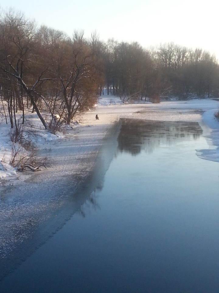 Žmogus žvejojo ant tokio plono ledo! Upė pilnai neužšalusi, matosi tekantis vanduo.