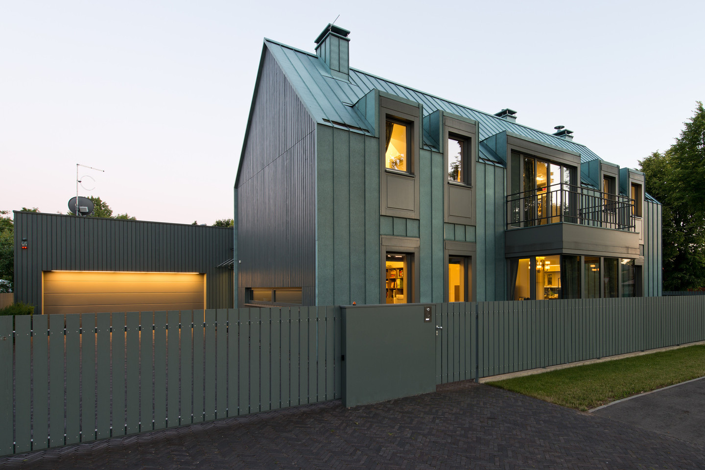 Naujasis iškilo lygiai senojo vietoje, visai arti gatvės – toks užstatymas būdingas Žaliakalniui. Namo stilistika, siluetas, jo tūris – viskas, pasak architekto, dera šiam rajonui, netgi ir neįprasta gyvenamajam namui fasado apdaila – sendinto vario danga.