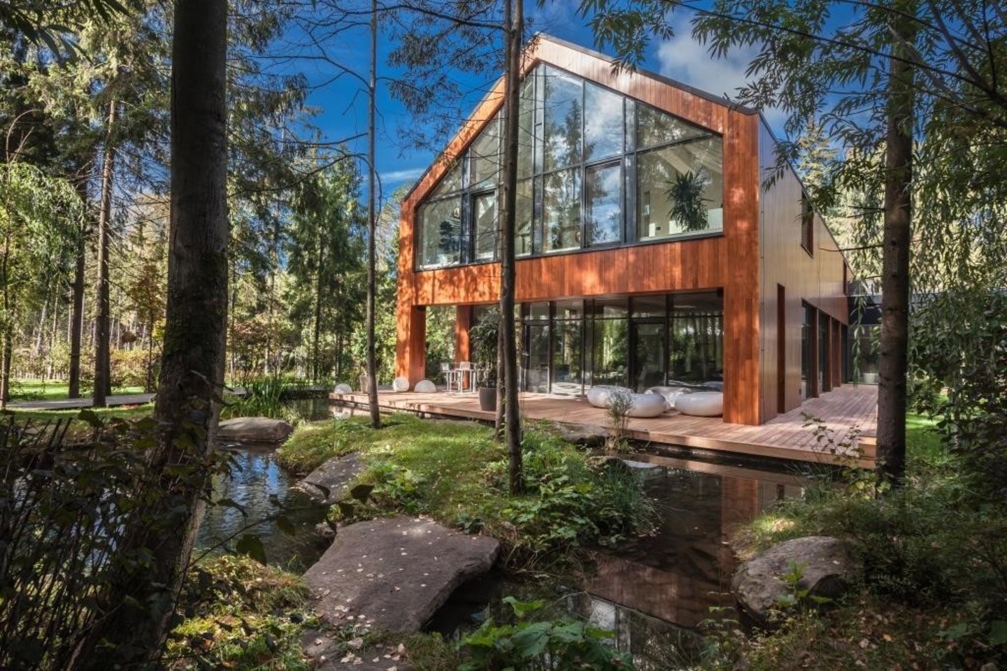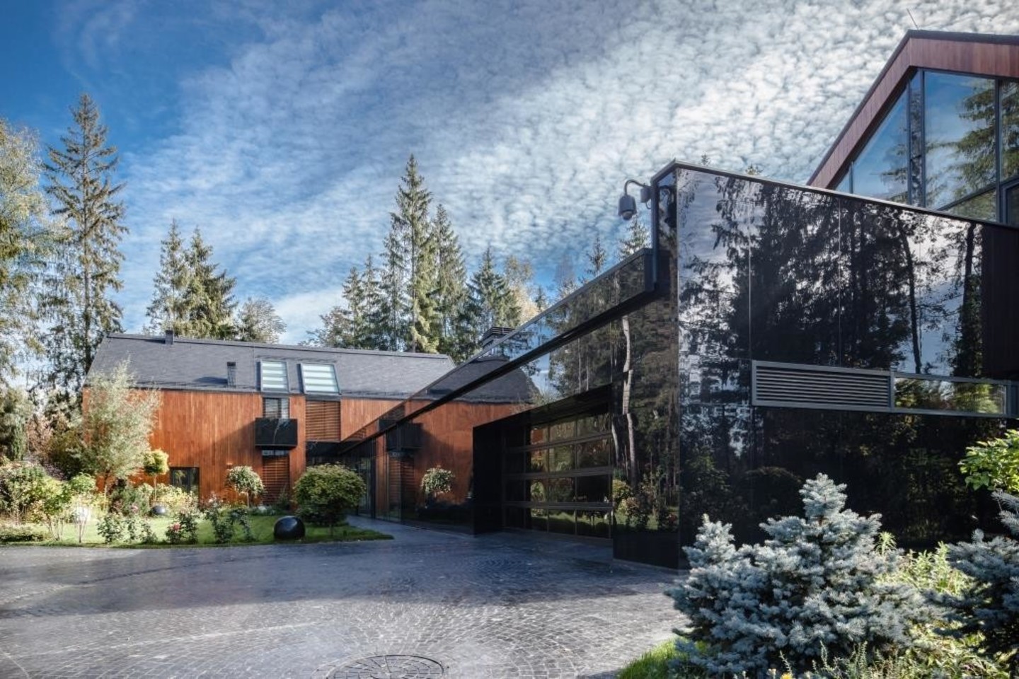 Kurdami šį privataus asmens užsakytą prabangų, „premium“ klasės keturių pastatų kompleksą, „AG studijos“ profesionalai dirbo daugiau nei trejus metus. Medžių apsuptame 2 hektarų sklype reikėjo harmoningai įkurdinti gyvenamąjį namą, pirtį, garažą su gyvenamosiomis patalpomis ir pavėsinę. Viso sodybinio komplekso plotas 2500 kv. m. Pagal kliento pageidavimą, pastatų išorinės konstrukcijos yra iš Suomijos atvežtų rąstų, suderintų su stiklo vitrinomis ir juodo berėmio stiklo fasadais.