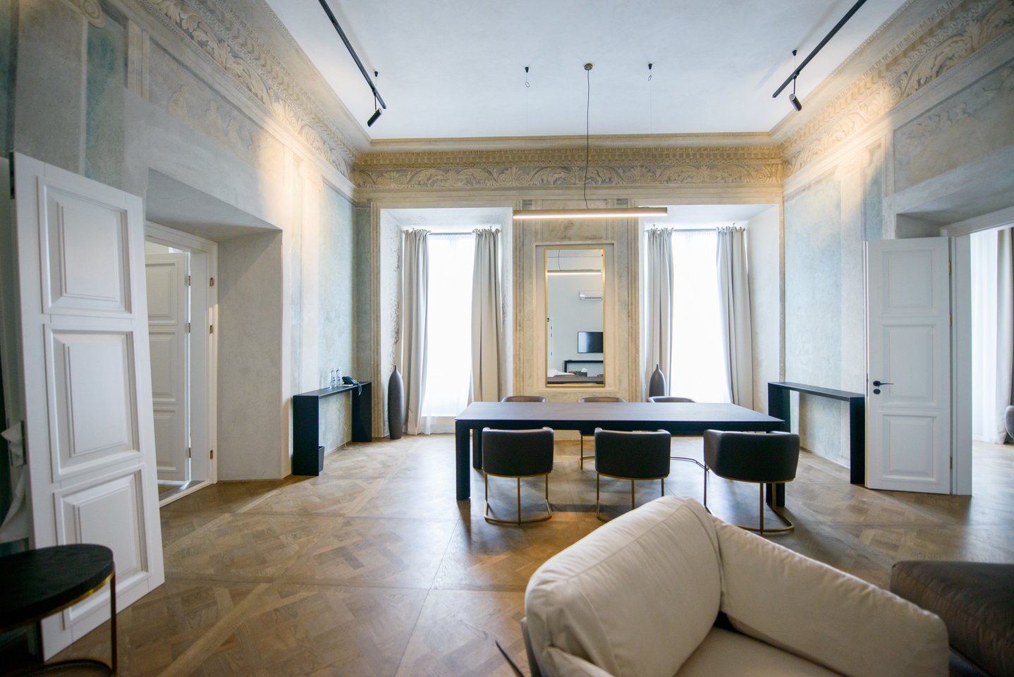 Architekčių pasiūlyto darbo mintis – kontrastas. Tarp istorinių freskų ir atidengtų sienų kūrėjos pasiūlė įkomponuoti šiuolaikišką, tačiau ne lakoniškomis formomis, o aukšta kokybe išsiskiriantį interjerą.