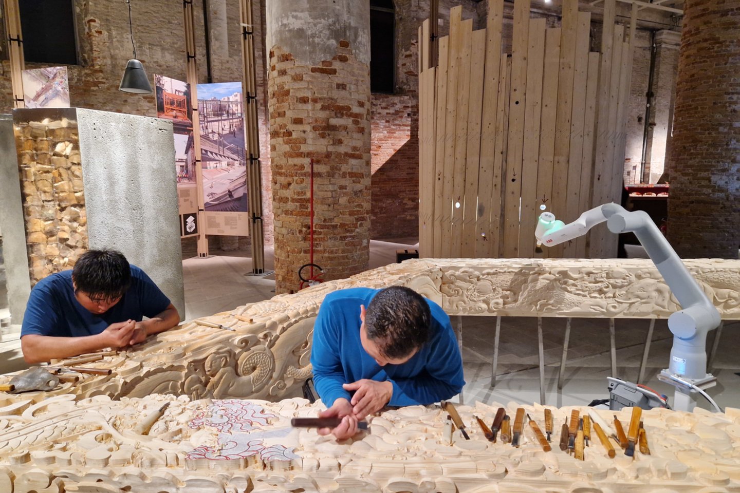 Kalbančių, grojančių ar sapnuojančių robotų ekspozicijos ir performansai sulaukia bene daugiausia lankytojų (ne architektų) dėmesio, o architektai ironiškai (bet negaliu negirdėti nerimo jų balsuose) klausia: „Tai dabar jau robotai už mus viską darys?“ Visko gal ir nedarys, bet kai ką jau daro, ir gerai, kad daro, nes tą gali daryti tiksliai, dideliu greičiu ir mastu: bienalėje gausu pavyzdžių apie gamyklose robotų gaminamus statybinius elementus iš medžio, betono, metalo; arba robotus, vykdančius statybos ar net apdailos (parodos „hitu“ tapęs BIG grupės instaliacija „Ancient future / Senovės ateitis“, kurioje realiu laiku medžio kolonas dekoratyviai raižo du meistrai iš Butano ir roboto ranka) darbus.