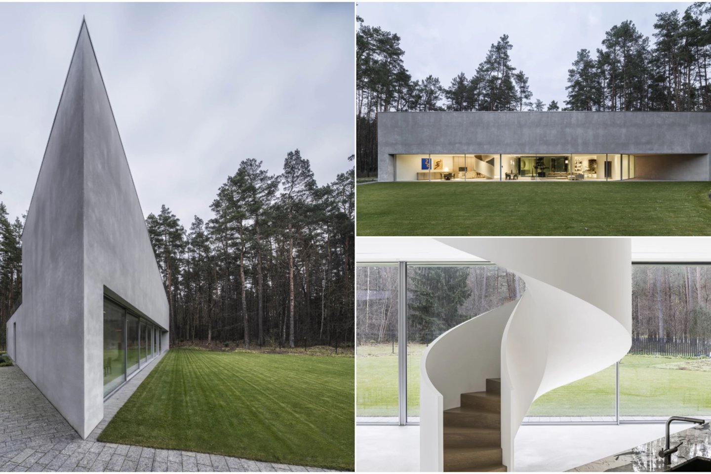 Namo plotas – 299 kv. m. Trikampė pastato forma ypač išryškėja siaurėjančiame kampe, kur tūris susiveda į aštrų tašką. Betonas ir stiklas susikerta griežtais kampais, o lenkta kiemo siena sušvelnina šį griežtumą.