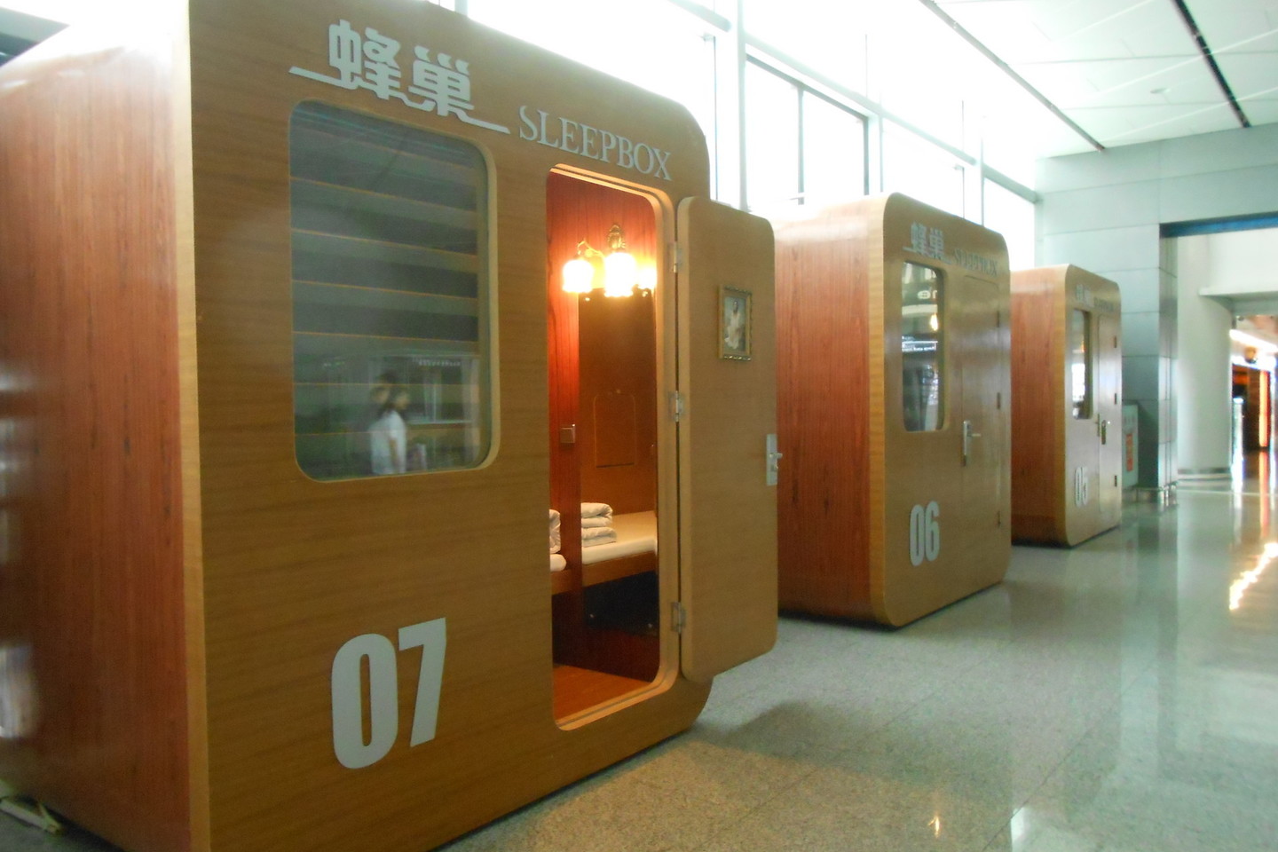 Kinijos miesto Siano oro uoste trečiajame terminale rikiuojasi 20 miegadėžių. Šis medinis namukas viso labo 3 kvadratinių metrų ploto. Čia yra ne tik lovos, bet ir televizorius, lempa, lentyna ir galimybė naudotis nemokamai internetu.