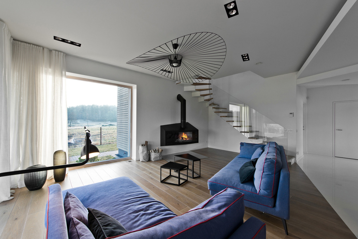 Už didelių langų interjeras – erdvus, ramus, baltas, išlaisvintas iš nereikalingų detalių, harmoningas. Kiek pralinksmina jį grafinis juodai baltų geometrinių detalių žaismas – namo pastato architektūrinio sprendimo atspindys interjere.