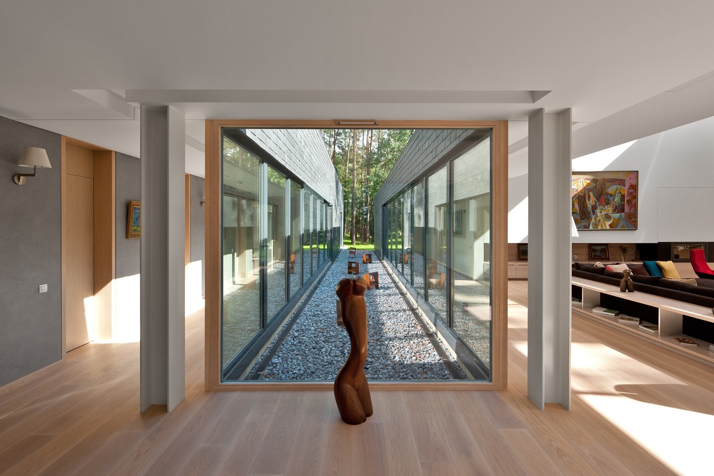 Ramioje vietoje, tiesiog gamtos oazėje, išdygsiančiam namui architektai būtinai norėjo sukurti kuo glaudesnį ryšį su gamta. Atrodytų paprastas, bet tobulas sprendimas tam puikiai tiko – stiklo sienos.