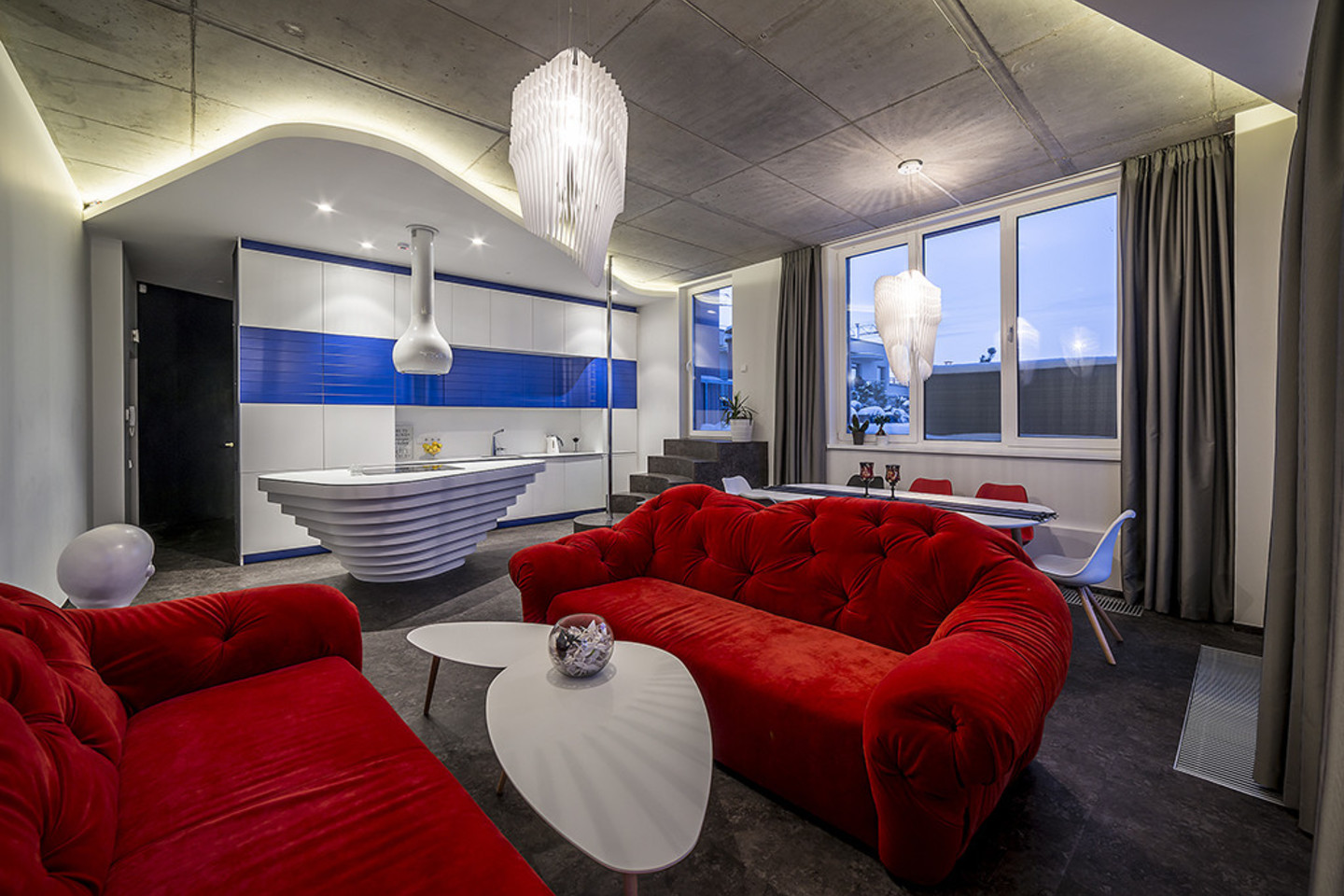 Interjerui parinkti ryškias raudoną ir mėlyną spalvas įkvėpė prieš porą metų vykusi dailininkės Agnė Kišonaitės paroda „Raudona ne mėlyna“. Šios spalvos taip pat derėjo ir vyriškai erdvei, kurioje niekuomet neįsikurs šeima, tad čia buvo galima drąsiai derinti griežtus ir tamsius tonus.