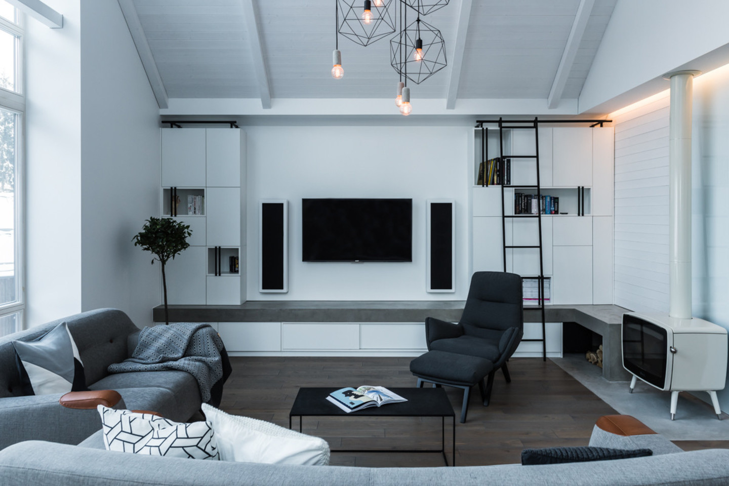 „Man labiausiai patinkantis sprendimas šiuose namuose, ko gero, yra svetainėje esanti senovinio stiliaus krosnelė ir šalia jos įrengta knygų lentyna su kopėčiomis – ši vieta papildomai paryškinta LED apšvietimu.