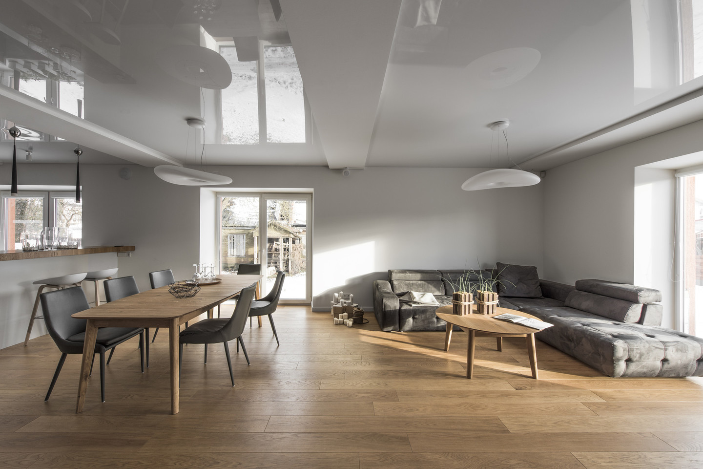Naujoms erdvėms moterys siekė suteikti kuo mažiau spalvų ir medžiagų triukšmo, todėl parinko trijų derinį: dažyta –balta – matinė, natūrali – ąžuolo – gelsva ir akmens – tamsiai pilka – juoda.