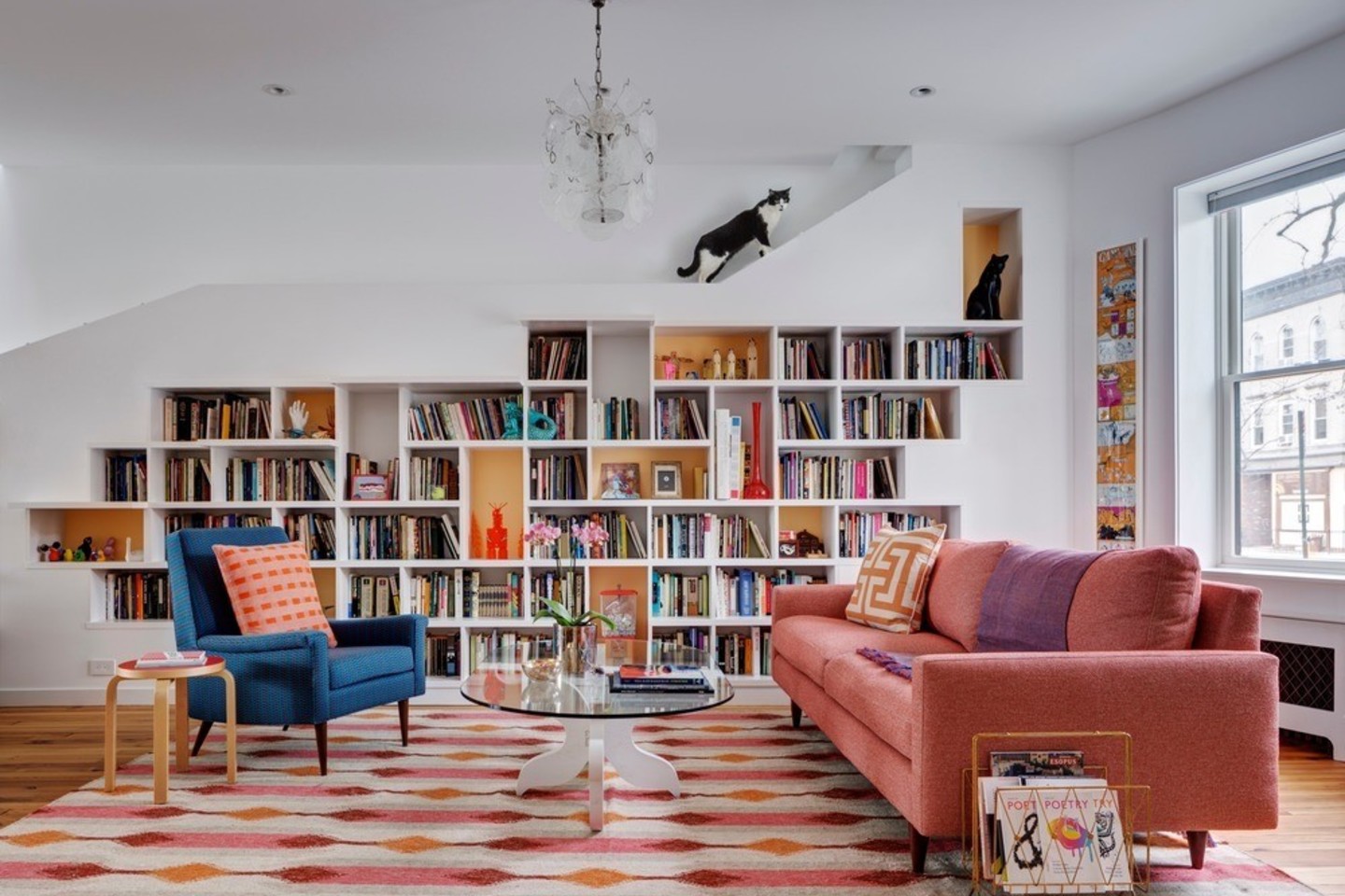 Svetainėje pagal užsakymą padaryta knygų lentyna eina išilgai visos kairės sienos. Ant knygų lentynų vidurio pro stoglangį krenta šviesa. Knygoms sudėti – gausybė kubo formos angų, o lentynų viršuje – dvi plokštumos, kurios ties viduriu kyla aukštyn. Tai – specialiai katėms skirti takai. O ir knygų lentynos suprojektuotos taip, kad ant šių pakylų galėtų užsikabaroti keturkojai.